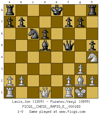 Last move : 1-0 2017 April 8 17:1:13 [Event "FICGS__CHESS__RAPID_E__000183"] [Site "FICGS"] [Date "2017.02.18"] [Round "1"] [White "Lavis,Jon"] [Black "Puzanov,Vasyl"] [Result "1-0"] [WhiteElo "1309"] [BlackElo "0899"] 1.g3 h5 2.Nf3 Nc6 3.d4 d5 4.Bg2 Nf6 5.O-O Bd7 6.c4 e6 7.cxd5 exd5 8.Nc3 Bd6 9.Bg5 Be6 10.Bxf6 Qxf6 11.e4 dxe4 12.Nxe4 Qf5 13.Nxd6+ cxd6 14.d5 Bxd5 15.Nh4 1-0 Lasker simul special Kingside Castling by player White (move 5) Player White won this chess game. Follow this game move after move (download)When I have White, I win because I am white; When I have Black, I win because I am Bogolyubov. (Bogolyubov) Schon mancher Spieler hat aufgegeben, um zu vermeiden, daß er eine Figur verliert. (Savielly Grigorievitsch Tartakower) Tu puedes aprender mucho mas de una partida que pierdas que de una partida ganada. Tendras que perder cientos de partidas antes de llegar a ser un buen jugador. (Jose Raul Capablanca) 'L'échange des dames est un coup dur pour les deux adversaires...' Un journaliste lors d'une partie du match Spassky-Fischer Just because you do not take an interest in politics doesn't mean politics won't take an interest in you. (Pericles 430 B.C.)