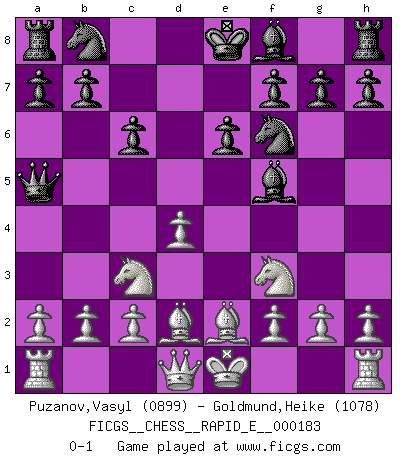 Last move : 0-1 2017 April 2 18:13:46 [Event "FICGS__CHESS__RAPID_E__000183"] [Site "FICGS"] [Date "2017.02.18"] [Round "1"] [White "Puzanov,Vasyl"] [Black "Goldmund,Heike"] [Result "0-1"] [WhiteElo "0899"] [BlackElo "1078"] 1.e4 d5 2.exd5 Qxd5 3.Nc3 Qa5 4.d4 Nf6 5.Nf3 Bf5 6.Bd2 c6 7.Be2 e6 0-1 Scandinavian defense Player Black won this chess game. Follow this game move after move (download)Examine moves that smite! A good eye for smites is far more important than a knowledge of strategical principles. (Purdy) Schach ist ein Teil der Kultur, und wenn es mit der Kultur abwärts geht, geht es auch mit dem Schach abwärts. (Mikhail Moiseyevich Botvinik) Dejen al perfeccionista jugar por correo. (Yasser Seirawan) Les échecs, c'est l'imagination. (David Bronstein) Internal peace cannot coexist with external war. (Don Groves)