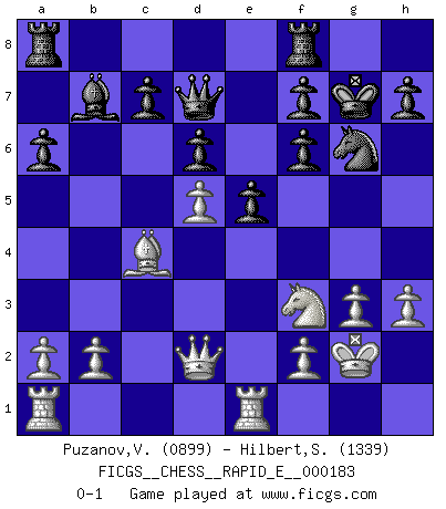 Last move : 0-1 2017 May 17 0:52:36 [Event "FICGS__CHESS__RAPID_E__000183"] [Site "FICGS"] [Date "2017.02.18"] [Round "1"] [White "Puzanov,Vasyl"] [Black "Hilbert,Stephan J."] [Result "0-1"] [WhiteElo "0899"] [BlackElo "1339"] 1.e4 a6 2.d4 b5 3.c4 Bb7 4.d5 e6 5.Nf3 Bb4+ 6.Bd2 Bxd2+ 7.Nbxd2 Ne7 8.Bd3 O-O 9.O-O bxc4 10.Bxc4 Ng6 11.Re1 e5 12.h3 d6 13.g3 Nd7 14.Kg2 Nf6 15.Nf1 Qd7 16.Ne3 Nxe4 17.Ng4 Nf6 18.Nxf6+ gxf6 19.Qd2 Kg7 0-1 St. George (Baker) defense Kingside Castling by player Black (move 8) Kingside Castling by player White (move 9) Player Black won this chess game. Follow this game move after move (download)The defensive power of a pinned piece is only imaginary. (Aaron Nimzovich) Wenn man heute mit 14 Jahren noch kein GM ist, kann man es vergessen. (Viswanathan Anand) Por la belleza de sus partidas, la claridad de su juego y lo brillante de sus ideas, Fischer se creó el mismo como un artista de la misma estatura como Brahms, Rembrandt y Shakespeare. (David Levy) Les Echecs ne sont pas pour les âmes timides. Ils requièrent un homme entier, qui ne s'arrête pas aveuglément à ce qui a été déjà établi, mais qui tente individuellement de sonder les profondeurs du jeu. (W. Steinitz) You cannot beat a roulette table unless you steal money from it. (Albert Einstein)