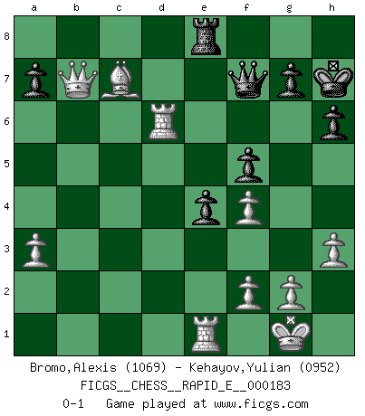 Last move : 0-1 2017 July 8 23:15:9 [Event "FICGS__CHESS__RAPID_E__000183"] [Site "FICGS"] [Date "2017.02.18"] [Round "1"] [White "Bromo,Alexis"] [Black "Kehayov,Yulian"] [Result "0-1"] [WhiteElo "1069"] [BlackElo "0952"] 1.d4 d5 2.c4 c6 3.h3 Qd6 4.e3 Nf6 5.a3 e5 6.Nc3 Be7 7.Nf3 O-O 8.c5 Qd8 9.Nxe5 Nbd7 10.Nxd7 Qxd7 11.Bd2 b6 12.Bd3 bxc5 13.dxc5 Bxc5 14.O-O Re8 15.b4 Bb6 16.Re1 h6 17.Ne2 Ne4 18.Bxe4 dxe4 19.Qc2 f5 20.Rad1 c5 21.bxc5 Bc7 22.c6 Qd6 23.Bb4 Qf6 24.Nf4 Bxf4 25.exf4 Re6 26.c7 Bb7 27.Ba5 Rc6 28.Qb3+ Kh7 29.Qxb7 Rxc7 30.Bxc7 Re8 31.Rd6 Qf7 0-1 This chess game has been lost on time (started : 2017.02.18 16:23:6) QGD Slav defense Kingside Castling by player Black (move 7) Kingside Castling by player White (move 14) Player Black won this chess game. Follow this game move after move (download)Tactics flow from a superior position. (Bobby Fischer) Glücklicherweise sind Großmeister Ruben Fines reine Schachbücher weniger phallozentrisch [als seine Schachpsychologie] und deswegen auch weniger lächerlich. (Nigel Short) Una mala movida nulifica cuarenta buenas. (Horowitz) Shah mat. Le roi est mort. Cri de fierté d'un joueur venant de terrasser son adversaire, courtoisement, sans effusion de sang. A good book on your shelf is a friend that turns its back on you and remains a friend. (Author unknown)