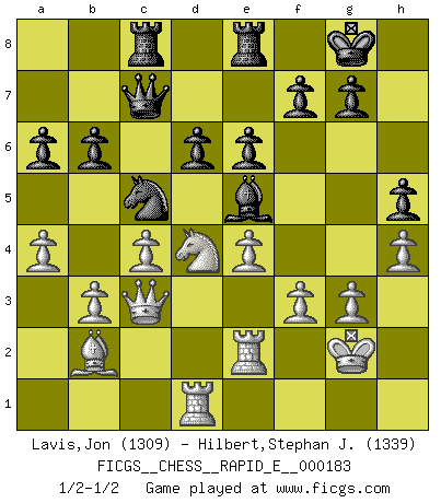 Last move : 1/2-1/2 2017 May 12 15:30:4 [Event "FICGS__CHESS__RAPID_E__000183"] [Site "FICGS"] [Date "2017.02.18"] [Round "1"] [White "Lavis,Jon"] [Black "Hilbert,Stephan J."] [Result "1/2-1/2"] [WhiteElo "1309"] [BlackElo "1339"] 1.g3 Nf6 2.Bg2 c5 3.c4 e6 4.Nf3 b6 5.Nc3 Bb7 6.d4 cxd4 7.Qxd4 a6 8.O-O d6 9.Rd1 Nbd7 10.Ng5 Bxg2 11.Kxg2 Rc8 12.Nge4 Rc6 13.Nxf6+ Nxf6 14.b3 Be7 15.Bb2 O-O 16.e4 Qc7 17.a4 Qb7 18.f3 Re8 19.Ra2 Nd7 20.Ne2 Bf6 21.Qd2 Be7 22.Qd3 Nc5 23.Qe3 h6 24.Nd4 R6c8 25.Ba1 Qc7 26.Rc2 Bg5 27.Qg1 h5 28.Qf2 Bf6 29.Qe3 Rcd8 30.h4 Nd7 31.Qc3 Be5 32.Bb2 Nc5 33.Re2 Rc8 1/2-1/2 Benko's Opening Kingside Castling by player White (move 8) Kingside Castling by player Black (move 15) This chess game ended in a draw. Follow this game move after move (download)When the Chess game is over, the Pawn and the King go back to the same box. (Irish saying) Frage: Was machen Sie mit den Preisen? Anwort: Ich habe Angst, dass meine Freundin davon neue Kleider kauft. (Loek van Wely) Debió haber existido una vez en que los hombres eran semidióses, de otra manera no hubiesen podido inventar el Ajedrez. (Gustav Schenk) Les erreurs sont comme les malheurs, elles n'arrivent jamais seules. (Siegbert Tarrasch) Computers make it easier to do a lot of things, but most of the things they make it easier to do don't need to be done. (Andy Rooney)