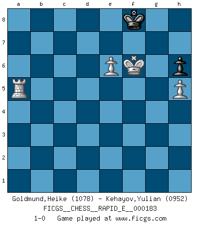 Last move : 1-0 2017 July 16 11:55:38 [Event "FICGS__CHESS__RAPID_E__000183"] [Site "FICGS"] [Date "2017.02.18"] [Round "1"] [White "Goldmund,Heike"] [Black "Kehayov,Yulian"] [Result "1-0"] [WhiteElo "1078"] [BlackElo "0952"] 1.e4 e5 2.Nf3 d6 3.Bc4 h6 4.c3 Nf6 5.d3 Be7 6.O-O O-O 7.Nbd2 Be6 8.Bxe6 c6 9.Bb3 d5 10.Re1 Na6 11.a3 dxe4 12.dxe4 Nc5 13.Ba2 b5 14.b4 Nd3 15.Re2 Nxc1 16.Qxc1 c5 17.Qc2 c4 18.Nxe5 Nd7 19.Nxd7 Qxd7 20.Rd1 Qe6 21.f3 a6 22.a4 bxa4 23.Bxc4 Qf6 24.Bd5 Rfd8 25.c4 Bxb4 26.Qxa4 a5 27.Bxa8 Rxa8 28.Nb3 Qb6+ 29.Kf1 Kh8 30.Rd5 Qc7 31.g3 Qxc4 32.Nxa5 Qc3 33.Ra2 Bxa5 34.Rxa5 Rxa5 35.Qxa5 Qxa5 36.Rxa5 g6 37.Kf2 Kg7 38.Ke3 g5 39.f4 gxf4+ 40.gxf4 f6 41.e5 fxe5 42.fxe5 Kf7 43.Kf4 Ke7 44.h4 Ke6 45.h5 Kf7 46.Kf5 Kg7 47.e6 Kf8 48.Kf6 1-0 This chess game has been lost on time (started : 2017.02.18 16:23:6) Philidor's defense Kingside Castling by player White (move 6) Kingside Castling by player Black (move 6) 10 pieces endgame at move 36 : White KRPPPP , Black KPPP WHITE : King + 1 Rook 4 Pawns BLACK : King + 3 Pawns 9 pieces endgame at move 39 : White KRPPP , Black KPPP WHITE : King + 1 Rook 3 Pawns BLACK : King + 3 Pawns 8 pieces endgame at move 40 : White KRPPP , Black KPP WHITE : King + 1 Rook 3 Pawns BLACK : King + 2 Pawns 7 pieces endgame at move 41 : White KRPP , Black KPP WHITE : King + 1 Rook 2 Pawns BLACK : King + 2 Pawns 6 pieces endgame at move 42 : White KRPP , Black KP WHITE : King + 1 Rook 2 Pawns BLACK : King + 1 Pawn Player White won this chess game. Follow this game move after move (download)Life is like a game of Chess, changing with each move. (Chinese proverb) Ein Springer auf f6 gegen die eigene Rochadestellung ist schlimmer als ein rostiger Nagel im Knie. (Efim Bogoljubov) El Ajedrez es una guerra en un tablero. El objetivo es aplastar la mente del oponente. (Bobby Fischer) Que feriez-vous si vous étiez en train de jouer aux échecs et que la fin du monde arrive ? Je continuerais à jouer. (Saint Borromée) Children in the dark cause accidents, accidents in the dark cause children. (Unknown)