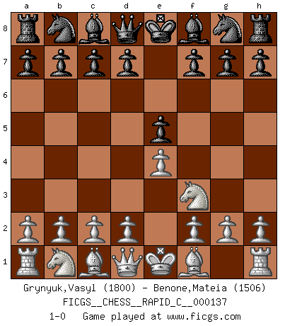 Last move : 1-0 2017 March 22 20:46:56 [Event "FICGS__CHESS__RAPID_C__000137"] [Site "FICGS"] [Date "2017.02.19"] [Round "1"] [White "Grynyuk,Vasyl"] [Black "Benone,Mateia"] [Result "1-0"] [WhiteElo "1800"] [BlackElo "1506"] 1.e4 e5 2.Nf3 1-0 This chess game has been lost on time (started : 2017.02.19 14:8:51) King's knight Opening Player White won this chess game. Follow this game move after move (download)The enormous mental resilience, without which no Chess player can exist, was so much taken up by Chess that he could never free his mind of this game. (Albert Einstein) Es war undenkbar für die Behörden, dass ein sowjetischer Großmeister auf diese Art und Weise [Fischer-Taimanov 6:0] verliert, ohne dass es eine politischer Erklärung dafür gäbe. (Mark Taimanov) Realmente no sabemos como el juego fue inventado, aunque hay sospechas. Tan pronto como descubramos a los culpables, se los haremos saber. (Bruce Pandolfini) Les Cavaliers se révèlent fort utiles dans les positions fermées. D'habitude, les Fous sont un peu plus forts que les Cavaliers dans les positions ouvertes. Qu'on le veuille ou non, il restera toujours des exceptions ! Wipe them out. All of them. (Darth Sidious in Star Wars ep.1)