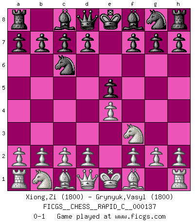 Last move : 0-1 2017 March 23 20:46:23 [Event "FICGS__CHESS__RAPID_C__000137"] [Site "FICGS"] [Date "2017.02.19"] [Round "1"] [White "Xiong,Zi"] [Black "Grynyuk,Vasyl"] [Result "0-1"] [WhiteElo "1800"] [BlackElo "1800"] 1.e4 e5 2.Nf3 Nc6 0-1 This chess game has been lost on time (started : 2017.02.19 14:8:51) King's pawn game Player Black won this chess game. Follow this game move after move (download)All I want to do, ever, is just play Chess. (Bobby Fischer) Kritik überlasse ich den Spießern. Ich zeige nichts, wofür ich mich schämen muss. (Alexandra Kosteniuk) Alguna parte de un error es siempre correcto. (Savielly Tartakover) Je crois qu'il existe des manières très spécifiques de jouer efficacement contre une machine. Evidemment, nous n'avons aucune chance en technique pure, parce que l'ordinateur calcule de manière parfaite. Mais lorsque nous faisons appel à notre cerveau, en utilisant l'intuition et la compréhension, alors nous restons beaucoup plus forts. (Anatoli Karpov) My poor ole parrot... Is not in the circulation of displays ....poo hoo hoo :) (Wayne Lowrance's enigma)