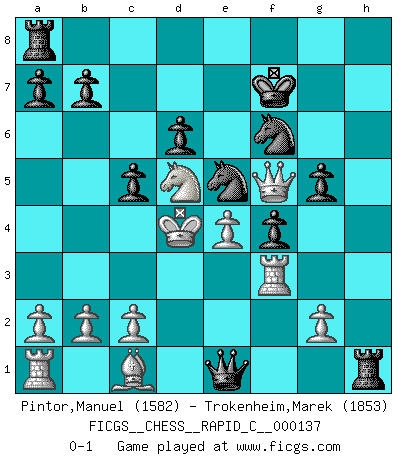 Last move : 0-1 2017 February 24 21:42:57 [Event "FICGS__CHESS__RAPID_C__000137"] [Site "FICGS"] [Date "2017.02.19"] [Round "1"] [White "Pintor,Manuel"] [Black "Trokenheim,Marek"] [Result "0-1"] [WhiteElo "1582"] [BlackElo "1853"] 1.e4 e5 2.f4 exf4 3.Nf3 g5 4.Bc4 Bg7 5.d4 d6 6.O-O h6 7.Nc3 Nc6 8.Bxf7+ Kxf7 9.h4 Bg4 10.Nxg5+ hxg5 11.Qxg4 Bxd4+ 12.Rf2 Rxh4 13.Qf5+ Nf6 14.Nd5 Qh8 15.Kf1 Rh1+ 16.Ke2 Qh4 17.Rf3 Qe1+ 18.Kd3 Ne5+ 19.Kxd4 c5+ 0-1 King's knight's gambit Kingside Castling by player White (move 6) Player Black won this chess game. Follow this game move after move (download)Pawn endings are to Chess what putting is to golf. (Cecil Purdy) Ich weiss nicht was Gott gegen mich auf 1.e4 antworten würde. (Robert James Fischer) Solo existe una cosa que Fischer hace en el Ajedrez sin placer: ¡perder!. (Boris Spassky) Des combinaisons [dans le jeu d'échecs] pareilles à des mélodies. Je crois entendre pour ainsi dire la musique des coups... (Vladimir Nabokov) It's not enough to succeed. Others must fail. (Gore Vidal)