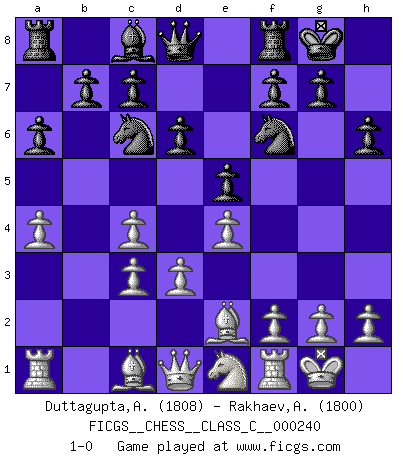 Last move : 1-0 2017 April 10 23:14:37 [Event "FICGS__CHESS__CLASS_C__000240"] [Site "FICGS"] [Date "2017.02.20"] [Round "1"] [White "Duttagupta,Aniruddha"] [Black "Rakhaev,Alexander"] [Result "1-0"] [WhiteElo "1808"] [BlackElo "1800"] 1.c4 e5 2.Nc3 Nf6 3.Nf3 Nc6 4.e4 Bb4 5.d3 h6 6.Be2 Bxc3+ 7.bxc3 O-O 8.O-O d6 9.Ne1 a6 10.a4 1-0 This chess game has been lost on time (started : 2017.02.20 11:50:5) English Opening Kingside Castling by player Black (move 7) Kingside Castling by player White (move 8) Player White won this chess game. Follow this game move after move (download)Weak points or holes in the opponent's position must be occupied by pieces not Pawns. (Siegbert Tarrasch) Der Partner hat auch seine Existenzberechtigung. (Savielly Grigorievitsch Tartakower) Para mi, el Ajedrez es la vida y cada partida es como una nueva vida. Todo jugador de Ajedrez suele vivir muchas vidas durante su vida. (Eduard Gufeld) Lorsque vous vous retrouvez devant une position atroce, ne tendez pas un ultime piège dérisoire avec l'intention d'abandonner si l'adversaire le déjoue ! Faites-vous plutôt un devoir de résister comme si votre vie en dépendait. Jouez le coup qui vous déplairait au centuple si vous étiez dans la peau de votre tortionnaire ! Luck is what you have left over after you give 100 percent. (Langston Coleman)