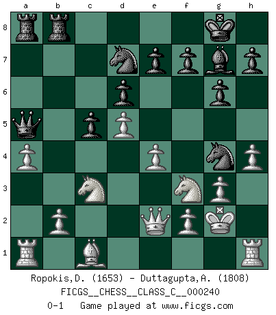 Last move : 0-1 2017 July 8 23:15:9 [Event "FICGS__CHESS__CLASS_C__000240"] [Site "FICGS"] [Date "2017.02.20"] [Round "1"] [White "Ropokis,Dimitrios"] [Black "Duttagupta,Aniruddha"] [Result "0-1"] [WhiteElo "1653"] [BlackElo "1808"] 1.d4 Nf6 2.c4 c5 3.d5 b5 4.cxb5 a6 5.bxa6 g6 6.Nc3 Bxa6 7.e4 Bxf1 8.Kxf1 d6 9.Nf3 Bg7 10.g3 Nbd7 11.h4 Qa5 12.Kg2 Ng4 13.Qe2 O-O 14.a4 Rfb8 0-1 Benko gambit accepted Kingside Castling by player Black (move 13) Player Black won this chess game. Follow this game move after move (download)Checkers is for tramps. (Paul Morphy) Man wirke der falschen Auffassung entgegen, als ob jeder Zug Unmittelbares zu leisten habe; auch Werte- und Ruhezüge haben ihre Existenzberechtigung. (Aaron Nimzowitsch) En el Ajedrez, cuando menos, el valiente hereda la tierra. (Edmar Mednis) Un footballeur joue avec ses pieds, parfois avec sa tête. Un joueur d'échecs ne joue qu'avec sa tête. Et quand il ne joue plus, il meurt. (Jacob Murray) Only sick music makes money today. (Friedrich Nietzsche)