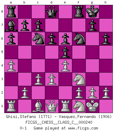 Last move : 0-1 2017 June 21 9:53:4 [Event "FICGS__CHESS__CLASS_C__000240"] [Site "FICGS"] [Date "2017.02.20"] [Round "1"] [White "Ghisi,Stefano"] [Black "Vasquez,Fernando"] [Result "0-1"] [WhiteElo "1771"] [BlackElo "1906"] 1.e4 e5 2.Nf3 Nf6 3.Bc4 Nc6 4.d3 Bc5 5.O-O O-O 6.c3 d6 7.a4 a6 8.Re1 h6 9.Nbd2 Ba7 10.Nf1 Be6 11.Bxe6 fxe6 0-1 This chess game has been lost on time (started : 2017.02.20 11:50:5) Petrov : Italian variation Kingside Castling by player White (move 5) Kingside Castling by player Black (move 5) Player Black won this chess game. Follow this game move after move (download)Chess is ruthless: you've got to be prepared to kill people. (Nigel Short) Nicht daß Diemer aus Opportunismus Mitglied der NSDAP geworden wäre. Er war ein Fanatiker, in allem, was er tat. (Hans Ree) La esencia del Ajedrez es pensar acerca de lo que el Ajedrez es. (David Bronstein) Aux échecs, l'amour-propre est satisfait quand on remporte la victoire, mais il n'y a pas de honte à être battu. (Benjamin Franklin) Wisdom is the reward you get for a lifetime of listening when you'd have preferred to talk. (Doug Larson)