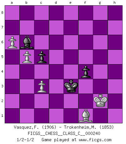 Last move : 1/2-1/2 2017 November 8 5:22:56 [Event "FICGS__CHESS__CLASS_C__000240"] [Site "FICGS"] [Date "2017.02.20"] [Round "1"] [White "Vasquez,Fernando"] [Black "Trokenheim,Marek"] [Result "1/2-1/2"] [WhiteElo "1906"] [BlackElo "1853"] 1.e4 e5 2.Nf3 Nc6 3.d4 exd4 4.Nxd4 Nf6 5.Nc3 Bb4 6.Nxc6 bxc6 7.Bd3 d5 8.exd5 cxd5 9.O-O O-O 10.Bg5 c6 11.Qf3 Be7 12.Rfe1 h6 13.Bf4 Be6 14.a3 Re8 15.h3 a5 16.Ne2 c5 17.Bb5 Rf8 18.Rad1 Ra7 19.a4 Bf5 20.c3 Be4 21.Qe3 Qb6 22.Be5 Nd7 23.Bg3 Nf6 24.f3 Bc2 25.Rd2 Bb3 26.Bf2 Bd6 27.Qd3 Rd8 28.Ng3 g6 29.Rde2 Kh7 30.Nf1 Nh5 31.g3 Rb7 32.f4 Bxf4 33.Qf3 Bd6 34.Nd2 Bc2 35.Rc1 Be4 36.Nxe4 dxe4 37.Rxe4 f5 38.Re6 Rf7 39.Rce1 Qb8 40.Re8 Rxe8 41.Rxe8 Qc7 42.Bc4 Re7 43.Rxe7+ Qxe7 44.Qa8 Kg7 45.Qxa5 Nxg3 46.Qa8 Ne4 47.Qg8+ Kf6 48.Qh8+ Kg5 49.h4+ Kg4 50.Be2+ Kh3 51.Bf1+ Kg4 52.Qxh6 Nxf2 53.Qxg6+ Kxh4 54.Qh6+ Kg4 55.Kxf2 Bg3+ 56.Kg2 Qe1 57.Qh3+ Kf4 58.a5 Qf2+ 59.Kh1 Ke3 60.b4 Qf3+ 61.Qg2 Bc7 62.a6 Bb6 63.b5 Qxg2+ 64.Kxg2 f4 1/2-1/2 Scotch : Schmidt variation Kingside Castling by player White (move 9) Kingside Castling by player Black (move 9) 10 pieces endgame at move 63 : White KBPPP , Black KQBPP WHITE : King + 1 Bishop 3 Pawns BLACK : King + 1 Queen 1 Bishop 2 Pawns 9 pieces endgame at move 64 : White KBPPP , Black KBPP WHITE : King + 1 Bishop 3 Pawns BLACK : King + 1 Bishop 2 Pawns This chess game ended in a draw. Follow this game move after move (download)To avoid losing a piece, many a person has lost the game. (Savielly Tartakover) Das Schach hält seine Meister in eigenen Banden, Fesseln; auf vielerlei Weise formt es ihren Geist, so dass die innere Freiheit selbst des Stärksten beeinflusst wird. (Albert Einstein) Solo puedes ser bueno en el Ajedrez si amas al juego. (Bobby Fischer) Horreur, mais aussi harmonie suprême : qu'y avait-il en effet au monde en dehors des échecs ? Le brouillard, l'inconnu, le non-être... (Vladimir Nabokov) The next best thing to gambling and winning is gambling and loosing. (Nick Dandalos)