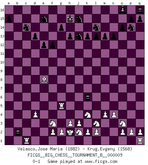 Last move : 0-1 2017 July 22 0:23:10 [Event "FICGS__BIG_CHESS__TOURNAMENT_B__000009"] [Site "FICGS"] [Date "2017.02.21"] [Round "1"] [White "Velasco,Jose Maria"] [Black "Krug,Evgeny"] [Result "0-1"] [WhiteElo "1882"] [BlackElo "1568"] 1.j2-k4 h14-h13 2.h1-o7 o15-o14 3.o7-c7 k15-k14 4.c7-c15 b16-c14 5.c15-l7 l15-l13 6.e2-e4 m15-m13 7.n2-n4 n15-n13 8.m2-m4 k16-l14 9.f1-b5 p16-n15 10.o1-d11 g15-g14 11.d2-d4 f15-f13 12.l1-p5 h16-d12 13.l7-h7 e15-e13 14.c1-j7 d12-b10 15.b1-c3 e13-e12 16.d11-f9 f16-e15 17.p5-e15 g16-e15 18.e1-e3 l16-o13 19.h7-j6 h15-j13 20.p1-o3 d15-d13 21.g1-j2 f13-f12 22.e3-g3 c16-k9 23.j6-k6 k9-e4 24.c3-e4 o13-e4 25.k6-k14 j16-h15 26.a1-e1 e4-c2 27.e1-e10 b10-b6 28.h2-f3 n15-p14 29.k14-k6 b6-k6 30.j7-k6 c2-j8 31.e10-j10 j8-h9 32.j10-b10 h9-a2 33.b10-b15 a16-b16 34.b15-b16 e16-b16 35.g3-g5 b16-b6 36.f9-c6 a2-l12 37.j1-h2 m16-b16 38.k1-l3 l12-k13 39.c6-k13 j14-k13 40.b5-e8 b6-k6 41.m1-c1 b16-b2 0-1 This big chess game has been lost on time (started : 2017.02.21 23:15:46) Follow this game move after move (download)In Chess, just as in life, today's bliss may be tomorrow's poison. (Assaic) Ich las kürzlich ein Buch von Nietzsche. Er sagte Religion verdumme nur die Menschen. Ich stimme zu. (Robert James Fischer) Cuando tu no sabes absolutamente que mas hacer, es tiempo de entrar en pánico. (John van der Wiel) Les Cavaliers se révèlent fort utiles dans les positions fermées. D'habitude, les Fous sont un peu plus forts que les Cavaliers dans les positions ouvertes. Qu'on le veuille ou non, il restera toujours des exceptions ! The only thing that overcomes hard luck is hard work. (Harry Golden)