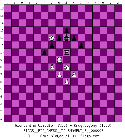 Last move : 0-1 2018 July 29 8:40:13 [Event "FICGS__BIG_CHESS__TOURNAMENT_B__000009"] [Site "FICGS"] [Date "2017.02.21"] [Round "1"] [White "Giordanino,Claudio"] [Black "Krug,Evgeny"] [Result "0-1"] [WhiteElo "1928"] [BlackElo "1568"] 1.j2-k4 h14-h13 2.h1-o7 o15-o14 3.o7-c7 k15-k14 4.c7-c15 b16-c14 5.c15-l7 l15-l13 6.h2-g4 m15-m13 7.e2-e4 n15-n13 8.l7-f7 f15-f14 9.m2-m4 l16-k15 10.d2-d4 g15-g13 11.n2-n4 f16-k12 12.k1-h2 h16-g15 13.g1-j2 b15-b14 14.f1-b5 c16-b15 15.b1-a3 p16-n15 16.p1-q3 m13-m12 17.l1-p5 k15-m13 18.f7-m7 e15-e14 19.o1-f9 n15-l14 20.j2-h4 g16-h14 21.h2-j4 h15-j13 22.h4-j6 k16-h15 23.j4-h6 c14-e13 24.e1-e3 e16-c16 25.c2-c3 b15-n4 26.o2-o3 n4-h9 27.j1-j2 h14-g12 28.e3-f3 p15-p14 29.c1-g5 c16-c15 30.m1-n1 g15-g14 31.e4-e5 a15-a14 32.m7-o9 o16-n15 33.l2-l3 a14-a13 34.j6-k8 h9-d5 35.f3-g3 m13-l12 36.o9-l6 a16-b16 37.g4-f6 d5-a2 38.c3-c4 a2-c4 39.a3-c4 l12-c4 40.g3-c3 b16-c16 41.n1-c1 c4-b5 42.f9-b5 c15-c3 43.b2-c3 j16-k15 44.f6-e4 l13-l12 45.q1-n1 k14-k13 46.h6-f7 j13-k11 47.e4-d6 c16-c12 48.k8-h7 m16-c16 49.c3-c4 k12-j11 50.l6-l5 c12-b12 51.g5-j7 e13-c12 52.j7-g9 j11-g9 53.h7-g9 h15-j13 54.f2-f4 d15-d13 55.c1-b1 n15-h10 56.p5-o4 h10-o4 57.q3-o4 o14-o13 58.b5-e8 b12-b1 59.n1-b1 g12-e11 60.g9-h11 j13-h11 61.e8-h11 g13-g12 62.h11-l8 n13-n12 63.q2-q4 g14-g13 64.o4-p6 f14-f13 65.q4-q5 g13-l9 66.k4-h5 k11-m10 67.l8-j6 l9-l5 68.m4-l5 j15-g14 69.p2-p4 m12-m11 70.h5-k6 e11-c10 71.a1-a10 c12-e11 72.b1-b14 g14-f12 73.b14-b15 k15-k14 74.b15-a15 c16-a16 75.a15-a13 a16-a13 76.a10-a13 m10-k11 77.a13-a15 k14-j13 78.d4-d5 p14-p13 79.k2-k4 p13-p12 80.g2-g4 q15-q13 81.j2-k3 n12-n11 82.k3-j4 q13-q12 83.c4-c5 q12-q11 84.c5-c6 n11-n10 85.h3-h4 q16-b16 86.d6-c8 b16-b8 87.c8-e9 c10-e9 88.f7-e9 b8-b4 89.f4-f5 b4-b5 90.a15-a12 e14-e13 91.j6-g8 e11-d9 92.e9-c8 b5-b8 93.g8-f7 b8-c8 94.f7-d9 c8-g8 95.d9-g6 k11-h10 96.d5-d6 g8-g9 97.c6-c7 g9-e9 98.e5-e6 h10-g8 99.g4-g5 g8-f10 100.d6-d7 e9-o9 101.o3-o4 o13-o12 102.f5-f6 q11-q10 103.a12-a16 f12-d11 104.e6-e7 p12-p11 105.d7-d8 f13-f12 106.c7-c8 f12-f11 107.c8-c9 d11-f12 108.a16-e16 e13-e12 109.e16-f16 f12-h11 110.l3-l4 d13-d12 111.j4-k5 q10-q9 112.g6-l2 p11-p10 113.j3-j4 d12-d11 114.h4-h5 l14-k12 115.g5-g6 p10-p9 116.f6-f7 q9-q8 117.l2-o5 f10-d9 118.e7-e8 d9-f8 119.k6-m5 f8-e10 120.d8-d9 e10-c9 121.p6-n7 o9-o8 122.f16-p16 p9-p8 123.n7-p8 c9-e8 124.f7-e8 o8-e8 125.p8-o6 e8-d8 126.p16-o16 d8-d9 127.o16-o12 e12-e11 128.o12-q12 d9-d8 129.o5-n6 d11-d10 130.n6-p8 e11-e10 131.q12-q8 d10-d9 132.q8-q16 d8-d1 133.q5-q6 d9-d8 134.j4-j5 e10-e9 135.h5-h6 e9-e8 136.g6-g7 e8-e7 137.o6-n4 e7-e6 138.n4-l3 h11-g9 139.q16-e16 d8-d7 140.p8-n6 d1-e1 141.k5-j4 g9-h7 142.j4-h4 e6-e5 143.h4-g4 d7-d6 144.m5-k6 h7-k6 145.l5-k6 e1-e4 146.g4-h5 e4-k4 147.l3-j4 k4-k1 148.p4-p5 k1-o1 149.o4-o5 o1-e1 150.e16-d16 e1-d1 151.h5-j6 e5-e4 152.j4-g3 d6-d5 153.g3-e4 d1-p1 154.d16-d5 p1-p5 155.d5-d16 p5-q5 156.d16-q16 k12-l10 157.q6-q7 l10-m8 158.q7-q8 m8-n6 159.o5-n6 q5-l5 160.q8-q9 l5-l4 161.e4-f6 l4-n4 162.q9-q10 n4-n6 163.q10-q11 n10-n9 164.q11-q12 n6-q6 165.j6-k5 n9-n8 166.q12-q13 n8-n7 167.f6-h7 n7-n6 168.k5-l5 q6-q7 169.h7-f8 q7-q5 170.l5-k4 n6-n5 171.f8-g6 m11-m10 172.q13-q14 m10-m9 173.q14-q15 m9-m8 174.k4-l5 m8-m7 175.l5-m5 m7-m6 176.m5-m6 n5-n4 177.q16-n16 q5-q15 178.n16-n4 q15-q1 179.m6-l7 q1-g1 180.g6-h8 g1-l1 181.l7-k8 l1-l5 182.j5-j6 h13-h12 183.n4-n16 j13-j12 184.k6-k7 j14-j13 185.h6-h7 l5-l11 186.g7-g8 l11-k11 187.k8-j9 k11-j11 188.j9-h9 j11-h11 189.h9-j9 h11-j11 190.j9-k9 j11-k11 191.k9-l10 k11-h11 192.h8-f9 h11-j11 193.n16-n6 g12-g11 194.f9-e11 f11-f10 195.e11-g12 j11-k11 196.n6-n8 j12-h13 197.g12-f14 h13-j12 198.f14-g12 j12-h13 199.g12-e11 k11-j11 200.n8-n6 h13-j12 201.e11-f9 j12-k12 202.f9-g7 j11-l11 203.l10-m10 l11-m11 204.m10-l10 m11-l11 205.l10-k10 l11-k11 206.k10-j9 k11-j11 207.j9-h9 k12-j12 208.h9-g10 j11-j10 209.g10-f11 j12-h11 210.g7-j8 l12-l11 211.n6-n9 k13-k12 212.n9-h9 h11-j11 213.f11-g12 j11-j12 0-1 This big chess game has been lost on time (started : 2017.02.21 23:15:46) Follow this game move after move (download)Chess is like life. (Boris Spassky) Nach Morphy wurde nichts neues mehr in der Behandlung offener Positionen gefunden. (Mikhail Moiseyevich Botvinik) Debes de llevar a tu oponente hacia un profundo y obscuro bosque donde 2+2=5, y el camino que conduce a la salida es suficientemente ancho para solamente uno. (Mikhail Tal) A chaque perte on perd un peu de soi. (Joël Lautier) Hello Thibault, if I have had a plan (and I had one, I hope), I have forgotten it during the last week... - Hello Heinz-Georg. What do you mean a plan ? (Anonymous players, during a Big Chess game)