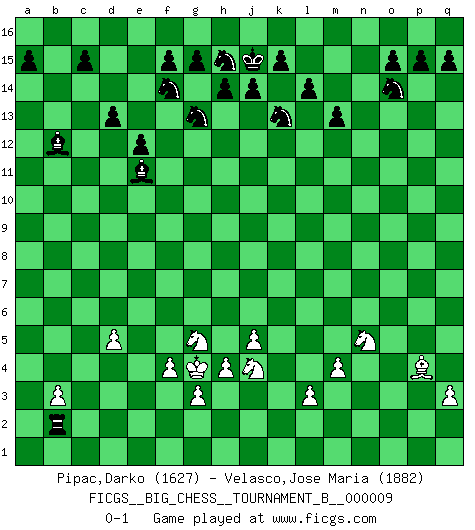 Last move : 0-1 2017 April 14 12:57:7 [Event "FICGS__BIG_CHESS__TOURNAMENT_B__000009"] [Site "FICGS"] [Date "2017.02.21"] [Round "1"] [White "Pipac,Darko"] [Black "Velasco,Jose Maria"] [Result "0-1"] [WhiteElo "1627"] [BlackElo "1882"] 1.j2-k4 m15-m13 2.h2-g4 j15-k13 3.g1-f3 h16-o10 4.m2-m4 n15-n13 5.k1-l3 o16-d6 6.j1-j2 d15-d13 7.j3-j4 e15-e13 8.k2-k3 l16-p12 9.l1-h4 o10-g10 10.g4-j5 f16-b12 11.n2-n4 d6-f8 12.k4-l6 g10-h10 13.k3-k4 p12-f3 14.e2-f3 h10-h4 15.g2-g3 h4-f6 16.h3-h4 b16-c14 17.j5-h7 f6-l6 18.j2-k2 f8-k4 19.l3-k5 l6-n4 20.p1-o3 m16-m14 21.o1-m3 n4-p4 22.h1-m5 e13-e12 23.j4-j5 c16-n6 24.m5-n5 n6-k9 25.h7-k6 k4-q10 26.n5-p5 m14-p14 27.p5-p4 p14-p4 28.q1-p1 k9-c2 29.b2-b3 c2-k9 30.f1-c4 l15-l14 31.c1-b2 p16-o14 32.q2-q3 p4-p12 33.d2-d3 p12-f12 34.b1-d2 q10-o12 35.f3-f4 h15-g13 36.m1-n1 o12-p11 37.d2-e4 k16-h15 38.b2-n13 p11-n13 39.a1-c1 f12-n12 40.e1-k1 n13-b2 41.c1-c2 b2-h8 42.k5-l7 k9-f5 43.l7-j6 f5-k1 44.k2-k1 h8-e11 45.e4-g5 q16-n16 46.c4-e6 n12-n1 47.p1-n1 n16-n1 48.o3-n1 e11-k6 49.n1-o3 k6-e11 50.d3-d4 j16-j15 51.d4-d5 g16-f14 52.l2-l3 e16-n16 53.k1-j2 n16-n11 54.m3-o5 n11-n2 55.j2-h3 n2-o2 56.o5-p4 o2-p2 57.h3-g4 p2-l2 58.g5-j4 a16-n16 59.j6-g5 n16-n2 60.e6-g8 n2-o2 61.g8-a14 b15-a14 62.c2-c14 l2-f2 63.c14-a14 f2-a2 64.a14-a2 o2-a2 65.o3-n5 a2-b2 0-1 Follow this game move after move (download)On the chessboard, lies and hypocrisy do not survive long. (Emanuel Lasker) Wer mein Gambit spielt, muß bereit sein, alle Brücken hinter sich abzubrechen. Es verändert den ganzen Menschen. Es wirkt wie ein Zauberstab und fördert verkümmerte, gute Charakter- eigenschaften wieder zu Tage. (Emil Joseph Diemer) Nunca antes ha habido un jugador de Ajedrez con tal conocimiento a fondo de las complejidades del juego y una inmensa voluntad absolutamente indomable de ganar. Yo pienso que Fischer es el jugador mas grande que jamás haya existido. (Lisa Lane) Il vaut mieux sacrifier les pièces de l'adversaire. (Xavier Tartacover) 98% of all statistics are made up. (Author unknown)