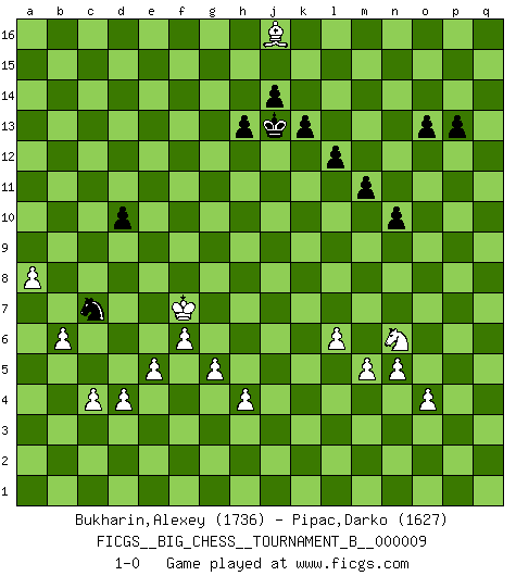 Last move : 1-0 2017 August 27 18:39:29 [Event "FICGS__BIG_CHESS__TOURNAMENT_B__000009"] [Site "FICGS"] [Date "2017.02.21"] [Round "1"] [White "Bukharin,Alexey"] [Black "Pipac,Darko"] [Result "1-0"] [WhiteElo "1736"] [BlackElo "1627"] 1.j2-k4 h15-g13 2.h1-o7 m15-m13 3.o7-c7 j15-k13 4.c7-c15 b16-c14 5.c15-o4 b15-b14 6.m2-m4 c16-b15 7.p1-o3 g16-f14 8.n2-n4 k16-l14 9.e2-e4 e15-e13 10.d2-d4 f16-b12 11.g1-f3 n15-n13 12.k1-l3 j16-h15 13.b1-c3 h16-m12 14.h2-g4 o16-f8 15.l3-j2 p16-o14 16.l1-m2 l16-p12 17.c1-g5 c14-d12 18.m4-m5 a16-c16 19.o1-j6 p12-j6 20.k4-j6 f8-m2 21.o3-m2 d15-d13 22.f1-d3 d12-f11 23.j2-h4 c16-c12 24.q1-n1 e16-c16 25.n1-n3 d13-d12 26.n3-p3 q16-p16 27.m2-k3 b15-a14 28.l2-l4 c12-c6 29.l4-l5 f14-e12 30.l5-l6 f15-f14 31.k3-l5 b12-e9 32.p3-p7 c6-c7 33.p7-c7 c16-c7 34.e4-e5 m16-c16 35.c3-e4 e9-g11 36.g5-k8 g11-k8 37.j6-k8 p16-o16 38.c2-c3 m12-j9 39.l5-j6 c7-c6 40.e4-f6 f11-h10 41.o4-p4 p15-p14 42.h4-g6 o14-n12 43.g6-j5 o15-o13 44.j5-k7 j9-j7 45.o2-o3 h10-j8 46.p4-j10 a14-j6 47.k8-j6 j7-j6 48.j10-j8 j6-n2 49.j1-j2 n2-p2 50.m1-m3 c6-c8 51.j8-j7 p2-n2 52.j7-n3 n2-n3 53.m3-n3 c16-c11 54.f3-g5 n12-l11 55.g5-j6 n13-n12 56.j6-h8 l14-k12 57.a2-a4 k12-j10 58.h8-j10 l11-j10 59.d3-f5 c8-b8 60.e1-e2 j10-h8 61.k7-h8 b8-h8 62.g4-j5 o16-c16 63.f6-e4 h8-h5 64.f5-k9 c16-c14 65.j5-k7 l15-l14 66.b2-b4 k13-j11 67.k9-g6 h5-h11 68.f2-f4 m13-m12 69.a1-p1 m12-m11 70.p1-p8 c11-c8 71.p8-c8 c14-c8 72.g2-g4 j11-g10 73.o3-o4 c8-q8 74.n3-n2 h11-h10 75.g6-k9 q8-q4 76.n2-o2 h10-n10 77.k9-o5 k15-k13 78.h3-h4 g13-j12 79.o5-f13 h15-j15 80.f13-e12 g10-f8 81.k7-l5 n10-q10 82.k2-k4 q4-q2 83.j2-h3 q2-q3 84.l5-n6 q10-p10 85.o2-q2 p10-p3 86.q2-q3 p3-q3 87.e2-p2 l14-l13 88.p2-p8 f8-e6 89.f4-f5 e6-g7 90.p8-g8 g7-j6 91.g8-g15 j15-k14 92.g15-a15 j6-k4 93.h3-j4 k4-l2 94.a15-b15 l2-j3 95.g4-g5 j3-l4 96.b15-b14 l4-k2 97.j4-h5 k2-h1 98.b14-f14 h1-g3 99.e4-g3 q3-g3 100.f14-c14 g3-n3 101.n4-n5 n3-k3 102.h5-j4 k3-k12 103.c14-c15 j12-l11 104.e12-k7 k12-f12 105.f5-f6 k14-j13 106.c15-q15 l11-m13 107.q15-p15 m13-o12 108.p15-e15 h14-h13 109.e15-e13 l13-l12 110.a4-a5 p14-p13 111.a5-a6 n12-n11 112.e13-e12 f12-e12 113.k7-e12 n11-n10 114.a6-a7 o12-m13 115.a7-a8 m13-k12 116.j4-h5 k12-h11 117.c3-c4 h11-f10 118.e12-j16 d12-d11 119.h5-g6 d11-d10 120.g6-f7 f10-d9 121.b4-b5 d9-c7 122.b5-b6 1-0 Follow this game move after move (download)Only sissies Castle. (Rob Sillars) Über Karpov: Er war und ist ein Vertreter der russischen Reaktionäre. Das steckt tief in seiner Seele, wehalb ich nicht nett mit ihm umgehen kann. (Viktor Kortschnoi) ¿Se han dado cuenta de que Fischer casi nunca ha tenido piezas malas? El las intercambia y las piezas malas se quedan con sus oponenets. (Yuri Balashov) C'est une question de caractère, Beaucoup de gens perdent leur motivation très vite. D'autres, ils sont rares, peuvent la conserver très longtemps. J'aime les échecs, encore aujourd'hui je suis heureux d'analyser des parties. J'aime toujours gagner, je déteste encore perdre. Bien jouer est important pour mon intégrité intellectuelle et morale. Et puis les échecs vivent en ce moment une période historique grâce à Internet. Ils se développent dans les systèmes éducatifs à travers le monde. Ils sortent de leur ghetto, et c'est mon rôle de mener à bien cette révolution. (Gary Kasparov) Man with more than one clock never knows what time it is. (Chinese thought)