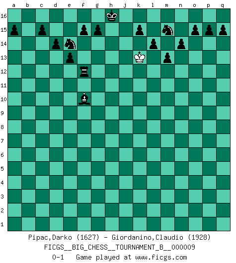 Last move : 0-1 2017 May 11 3:55:29 [Event "FICGS__BIG_CHESS__TOURNAMENT_B__000009"] [Site "FICGS"] [Date "2017.02.21"] [Round "1"] [White "Pipac,Darko"] [Black "Giordanino,Claudio"] [Result "0-1"] [WhiteElo "1627"] [BlackElo "1928"] 1.j2-k4 m15-m13 2.h2-g4 j15-k13 3.k1-l3 h15-g13 4.g1-f3 p16-o14 5.p1-o3 b16-c14 6.b1-c3 l16-p12 7.c3-d5 e15-e13 8.d5-f6 f16-b12 9.f6-h5 n15-n14 10.d2-d4 k16-h15 11.e2-e4 d15-d14 12.c2-c3 h16-p9 13.h1-o7 o16-f8 14.c1-m10 g16-j15 15.o7-o8 p9-o8 16.m10-o8 c16-l8 17.h5-f6 e16-e14 18.e4-e5 h15-j13 19.f1-b5 j15-h13 20.n2-n4 k13-j11 21.m2-m4 g13-h11 22.l1-q6 m16-m14 23.j1-h2 m14-l14 24.o8-j13 h14-j13 25.f6-h7 f8-d10 26.q6-j13 h11-j13 27.b5-l14 j13-l14 28.a2-a3 e14-f14 29.o1-k5 j16-j15 30.h7-j9 l8-m9 31.j9-h11 a16-h16 32.e1-e4 m9-g4 33.h3-g4 h13-f12 34.h2-j2 f12-h11 35.m1-h1 p12-o13 36.e4-e3 f14-f12 37.h1-h3 f12-p12 38.p2-p3 p12-o12 39.o3-q4 h16-h12 40.f3-h4 b12-c13 41.o2-o4 c13-m4 42.n4-n5 l14-j13 43.f2-f3 h12-b12 44.q1-m1 m4-e11 45.h4-j6 b12-b2 46.j2-h2 e11-j7 47.a1-b1 b2-b1 48.m1-b1 j7-e3 49.b1-b15 d10-a13 50.b15-b11 q16-b16 51.b11-h11 j13-h11 52.h3-h11 j11-h13 53.l3-j4 e3-c1 54.a3-a4 c1-b2 55.k5-n8 b2-c3 56.n8-h13 j14-h13 57.h11-h13 c3-d4 58.h13-h11 d4-e5 59.g2-g3 o12-a12 60.j4-g5 a12-a4 61.h2-h3 b16-h16 62.h11-h16 j15-h16 63.f3-f4 o13-q11 64.h3-h4 e5-f6 65.k4-h5 f6-b10 66.k2-k4 a4-a2 67.l2-l4 a2-q2 68.l4-l5 q11-p12 69.j6-g7 p12-l8 70.h4-j5 l8-h5 71.g4-h5 a13-g7 72.h5-h6 g7-k10 73.q4-o5 k10-m8 74.j5-h5 m8-g3 75.f4-f5 q2-f2 76.h5-g6 g3-h2 77.j3-j4 h2-k4 78.o5-m6 k4-l5 79.j4-j5 f2-g2 80.g6-h7 g2-g5 81.f5-f6 g5-j5 82.m6-k7 j5-f5 83.k7-l5 f5-l5 84.f6-f7 l5-l7 85.h7-g6 b10-c11 86.h6-h7 c11-n1 87.p3-p4 n1-p3 88.o4-o5 p3-n5 89.g6-g7 n5-l3 90.g7-g8 l7-l8 91.h7-h8 l3-m4 92.g8-f9 l8-h8 93.f9-g10 c14-d12 94.p4-p5 h8-h5 95.f7-f8 h5-o5 96.f8-f9 o5-p5 97.f9-f10 p5-f5 98.g10-g11 f5-f10 99.g11-g12 f10-f11 100.g12-h13 f11-f12 101.h13-g13 d12-e14 102.g13-h13 o14-m15 103.h13-j13 m4-f10 104.j13-k13 l15-l14 0-1 Follow this game move after move (download)Is Bobby Fischer quite sane ? (Salo Flohr) Schachspieler können ausgezeichnet Varianten am Schachbrett berechnen, aber nicht im realen Leben. Zu stark ist der Individualismus im Schach ausgeprägt, und für viele ist ein kleiner momentaner persönlicher Vorteil wichtiger als ein weit größerer Vorteil von morgen. (Anatoly Karpov) No es una movida, aún la mejor movida que tu debas buscar, sino un plan comprensible. (Eugene Znosko-Borovsky) Shah mat. Le roi est mort. Cri de fierté d'un joueur venant de terrasser son adversaire, courtoisement, sans effusion de sang. A journey of a thousand sites begins with a single click. (Author unknown)