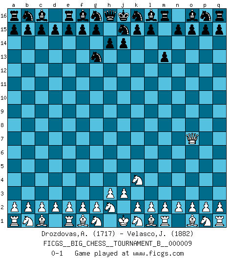 Last move : 0-1 2017 February 22 13:41:14 [Event "FICGS__BIG_CHESS__TOURNAMENT_B__000009"] [Site "FICGS"] [Date "2017.02.21"] [Round "1"] [White "Drozdovas,Arturas"] [Black "Velasco,Jose Maria"] [Result "0-1"] [WhiteElo "1717"] [BlackElo "1882"] 1.j2-k4 h15-g13 2.h1-o7 m15-m13 0-1 Follow this game move after move (download)Let the perfectionist play postal. (Yasser Seirawan) Man wirke der falschen Auffassung entgegen, als ob jeder Zug Unmittelbares zu leisten habe; auch Werte- und Ruhezüge haben ihre Existenzberechtigung. (Aaron Nimzowitsch) El jugador táctico debe saber que hacer cuando algo se debe de hacer. El estratégico debe saber que hacer cuando nada se debe de hacer. (Savielly Tartakover) Une platitude souvent récitée à propos des Echecs est qu'une des choses les plus difficiles à réaliser est de gagner une position gagnante. Cela ne manque pas de sens mais, pour ma part, j'ai toujours trouvé plus difficile de gagner une position perdante. (Tim Krabbe) The only sure thing about luck is that it will change. (Wilson Mizner)