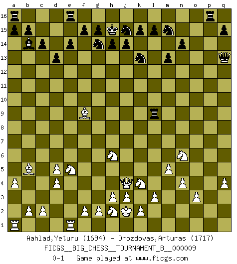 Last move : 0-1 2017 April 5 17:40:15 [Event "FICGS__BIG_CHESS__TOURNAMENT_B__000009"] [Site "FICGS"] [Date "2017.02.21"] [Round "1"] [White "Aahlad,Yeturu"] [Black "Drozdovas,Arturas"] [Result "0-1"] [WhiteElo "1694"] [BlackElo "1717"] 1.m2-m4 j15-k13 2.e2-e4 h16-o10 3.h2-g4 p16-o14 4.f1-b5 g16-j15 5.j2-k4 d15-d13 6.b1-c3 m15-m13 7.l1-p5 c16-f13 8.h1-p8 l16-p12 9.k1-h2 p12-n10 10.p8-j8 e15-e14 11.d2-d4 f13-l8 12.c1-e3 o10-p10 13.q2-q4 b16-d15 14.m1-m3 n15-n14 15.m3-l3 l8-k7 16.j8-l10 k7-m9 17.l10-c10 f16-c13 18.l3-l9 p10-p12 19.p1-o3 o16-j11 20.l9-f9 j11-p5 21.o3-p5 c13-b14 22.q1-q3 c15-c14 23.g1-f3 d15-f14 24.l2-l3 j15-g14 25.q3-o3 m16-m14 26.n2-n4 m14-l14 27.a2-a4 q16-m16 28.p5-n6 m9-k7 29.m4-m5 k7-e12 30.c10-j4 e12-d11 31.f9-f14 h15-f14 32.o1-d11 p12-p2 33.o3-o10 n10-l12 34.d11-f9 j16-h15 35.o2-o3 k16-m15 36.j1-j2 p2-p9 37.o10-p10 p9-q9 38.p10-p15 m16-p16 39.p15-o15 q9-q13 40.o15-n15 b14-g9 41.n15-m15 o14-m15 42.e3-l9 g9-b14 43.c3-d5 f14-h13 44.g4-h6 h13-j15 45.f3-e5 l12-d5 46.e4-d5 l14-l9 0-1 Follow this game move after move (download)Life is like a game of Chess, changing with each move. (Chinese proverb) Wer sich die Fähigkeit anerziehen will im Schach selbstständig zu denken, der muß alles meiden, was leblos ist: ausgeklügelte Theorien, die sich auf sehr wenige Beispiele und eine Menge Hirngespinste stützen. (Emanuel Lasker) Los asuntos humanos son como una partida de Ajedrez: solo aquellos que no lo toman seriamente, pueden ser llamados buenos jugadores. (Hung Tzu Ch'eng) Le moment que je préfère le plus dans une rencontre, c'est celui où je sens que la personnalité de l'adversaire se brise. (Robert Fischer) Be who you are, and say what you feel because those who mind don't matter, and those who matter don't mind. (Dr Seuss)
