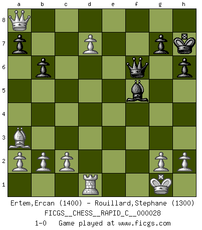 Last move : 1-0 2007 June 15 19:39:34 [Event "FICGS__CHESS__RAPID_C__000028"] [Site "FICGS"] [Date "2007.04.04"] [Round "1"] [White "Ertem,Ercan"] [Black "Rouillard,Stephane"] [Result "1-0"] [WhiteElo "1400"] [BlackElo "1300"] 1.d4 e5 2.dxe5 f6 3.Nf3 Nc6 4.Nc3 fxe5 5.e4 Nf6 6.Bc4 h6 7.O-O Bc5 8.Nd5 O-O 9.Nxf6+ Kh8 10.Nd5 d6 11.Be3 Na5 12.Qd3 c6 13.Nxe5 dxe5 14.Bxc5 Nxc4 15.Qxc4 cxd5 16.exd5 Re8 17.d6 Be6 18.Qe4 b6 19.Ba3 Qf6 20.f4 Bf5 21.fxe5 Rxe5 22.Qxa8+ Kh7 23.d7 Rd5 24.Rad1 Rxd1 25.Rxd1 1-0 This chess game has been lost on time (started : 2007.04.04 1:2:25) Queen's pawn : Charlick (Englund) gambit Kingside Castling by player White (move 7) Kingside Castling by player Black (move 8) Player White won this chess game. Follow this game move after move (download)Chess is a foolish expedient for making idle people believe they are doing something very clever when they are only wasting their time. (George Bernard Shaw) Du musst Deinen Gegner in einen tiefen dunklen Wald führen wo 2+2=5 ist und wo der Weg, der wieder hinausführt, nur breit genug für einen ist. (Mikhail Nekhemyevich Tal) Tu puedes aprender mucho mas de una partida que pierdas que de una partida ganada. Tendras que perder cientos de partidas antes de llegar a ser un buen jugador. (Jose Raul Capablanca) La vie et les Echecs sont tous les deux une lutte constante. (Lasker) Good luck. You're gonna need it. (Han Solo in Star Wars ep.6)