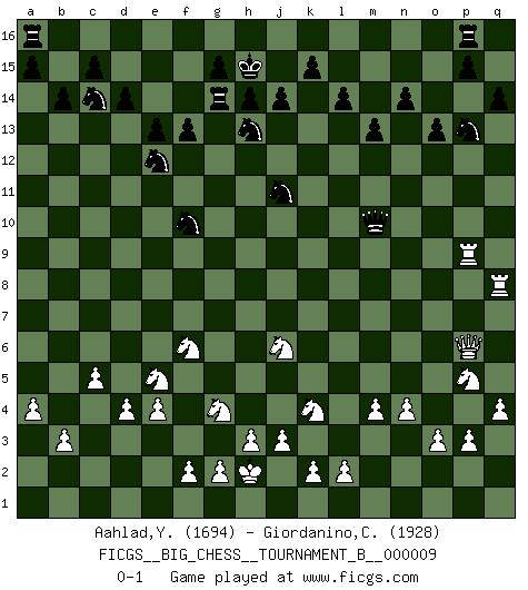 Last move : 0-1 2017 June 29 20:25:31 [Event "FICGS__BIG_CHESS__TOURNAMENT_B__000009"] [Site "FICGS"] [Date "2017.02.21"] [Round "1"] [White "Aahlad,Yeturu"] [Black "Giordanino,Claudio"] [Result "0-1"] [WhiteElo "1694"] [BlackElo "1928"] 1.m2-m4 j15-k13 2.e2-e4 h15-g13 3.j2-k4 m15-m13 4.h1-o7 e15-e13 5.l1-p5 h16-p9 6.q2-q4 k16-h15 7.q1-q3 g16-j15 8.q3-p3 p9-n9 9.h2-g4 b16-c14 10.f1-b5 p16-o14 11.d2-d4 n15-n14 12.c1-l9 f16-b12 13.e1-e3 d15-d14 14.b1-c3 j15-h13 15.g1-f3 h15-j13 16.k1-l3 m16-m14 17.p3-n3 n9-q12 18.p2-p3 m14-l14 19.c3-d5 o16-f8 20.p5-m8 q12-c12 21.c2-c4 c16-h11 22.b5-h11 g13-h11 23.f3-e5 l16-m15 24.n3-n7 j16-h15 25.n2-n4 c12-g12 26.l3-m5 f15-f13 27.d5-f6 f8-j11 28.o1-g8 j11-l9 29.m8-l9 l14-l9 30.m1-m3 k13-j11 31.a2-a4 g12-g9 32.c4-c5 l9-o9 33.o7-p6 o9-p9 34.n7-p7 m15-j12 35.p6-p5 p9-p7 36.p5-p7 q16-p16 37.p1-o3 j12-m9 38.m3-l3 l15-l14 39.a1-a3 m9-p12 40.a3-b3 e16-e14 41.b3-b10 h11-f10 42.g8-h7 j13-g12 43.e3-b3 g9-a9 44.b3-b4 e14-g14 45.b2-b3 f10-e12 46.h7-j6 p12-j6 47.k4-j6 b12-l3 48.m5-l3 b15-b14 49.l3-m5 a9-f9 50.m5-k4 g12-f10 51.b10-b9 f9-g10 52.o3-p5 g10-o10 53.o2-o3 o10-m12 54.b4-b8 m12-k12 55.p7-p6 o14-n12 56.b9-o9 o15-o13 57.b8-q8 q15-q14 58.o9-p9 n12-p13 59.j1-h2 k12-m10 0-1 Follow this game move after move (download)Nonsense was the last thing Fischer was interested in, as far as Chess was concerned. (Elie Agur) Sie führen leise Selbstgespräche, schlürfen lautstark ihre Getränke, schmatzen hörbar beim Essen, blasen ihrem Gegenüber Rauch in die Augen, niesen ihm ins Gesicht, starren ihn unverwandt an, bis er sich unter ihren Blicken windet, rutschen ständig auf ihrem Stuhl hin und her, rülpsen und bohren in der Nase. (Anonymous) El Jaque al descubierto es el bombardero del tablero. (Reuben Fine) Les Echecs sont et restent toujours un combat, un combat intégral comme la boxe, la lutte ou un autre sport, et où il doit y avoir un vainqueur et un vaincu. (Joseph Emil Diemer) Question: Is 'This statement is paradoxical' a paradoxical statement ? Or is it a meta-paradox ? (Normajean Yates)