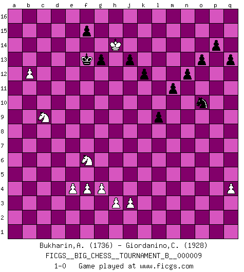Last move : 1-0 2017 December 9 14:49:46 [Event "FICGS__BIG_CHESS__TOURNAMENT_B__000009"] [Site "FICGS"] [Date "2017.02.21"] [Round "1"] [White "Bukharin,Alexey"] [Black "Giordanino,Claudio"] [Result "1-0"] [WhiteElo "1736"] [BlackElo "1928"] 1.j2-k4 m15-m13 2.h1-o7 h15-g13 3.o7-c7 j15-k13 4.c7-c15 h16-o10 5.c15-f12 o10-o2 6.p1-o3 o2-k6 7.h2-g4 p16-o14 8.g1-f3 b16-c14 9.d2-d4 l16-p12 10.m2-m4 k16-h15 11.e2-e4 n15-n14 12.b1-c3 g16-j15 13.k1-l3 e15-e13 14.f12-f6 k6-f6 15.g4-f6 f16-b12 16.n2-n4 o16-f8 17.c1-g5 d15-d14 18.l1-n3 c16-l8 19.o1-h7 j15-h13 20.q1-o1 h15-j13 21.f1-d3 k13-j11 22.c3-d5 g13-h11 23.c2-c4 m16-m14 24.c4-c5 e16-e14 25.b2-b4 e14-f14 26.a2-a4 m14-l14 27.b4-b5 j16-h15 28.b5-b6 g15-g14 29.d3-b5 l14-l12 30.l3-j2 f14-f12 31.f3-h4 h11-j9 32.h7-j6 j13-h11 33.j6-l8 l12-l8 34.b5-e2 l8-p8 35.e2-p12 p8-p12 36.o1-o2 a16-c16 37.f2-f4 l15-l13 38.g2-g4 j11-h9 39.j1-h2 h13-j11 40.h4-g6 f8-g9 41.m1-m3 p12-g12 42.j2-h4 h9-g7 43.k4-h5 g7-e6 44.g5-j7 e6-d4 45.j7-g9 h11-g9 46.n3-o4 j11-l10 47.e1-d1 d4-b3 48.a1-a2 b3-c5 49.m3-k3 g12-k12 50.o4-m2 b12-c13 51.g6-e5 c14-d12 52.k3-k12 f12-k12 53.m2-f8 d12-b13 54.f8-c5 k12-k2 55.h4-j2 k2-k11 56.j2-k4 l13-l12 57.c5-e7 a15-a14 58.l2-l4 k11-o11 59.h2-g3 o14-n12 60.a2-c2 c13-d12 61.d1-d2 g9-h7 62.f6-h7 j9-h7 63.c2-c16 q16-c16 64.d2-c2 o11-c11 65.c2-c11 c16-c11 66.e7-b10 c11-c1 67.b10-d12 b13-d12 68.o3-n5 o15-o14 69.n5-l6 d12-b11 70.o2-o7 h7-j9 71.o7-b7 b11-c13 72.p2-p4 q15-q13 73.b7-b14 c1-a1 74.b14-d14 a1-a4 75.h5-f6 a4-a2 76.q2-q4 a2-n2 77.l6-n5 l10-m8 78.d14-d13 c13-e14 79.d13-e13 n2-n4 80.k4-l2 m8-n6 81.e13-e9 j9-l10 82.e9-b9 n6-m4 83.l2-m4 n4-n5 84.b9-b15 e14-g13 85.b15-a15 n5-n4 86.m4-o5 n4-p4 87.a15-a14 p4-l4 88.a14-a10 l4-o4 89.a10-l10 o4-o5 90.l10-q10 p15-p14 91.b6-b7 o5-o10 92.q10-o10 n12-o10 93.g3-h4 m13-m12 94.b7-b8 g13-e14 95.h4-h5 g14-g13 96.e5-d7 h15-g14 97.h5-h6 l12-l11 98.f6-h7 n14-n13 99.d5-f6 k15-k13 100.h6-g7 l11-l10 101.g7-h8 k13-k12 102.h8-h9 g14-h13 103.h7-j9 m12-m11 104.h9-j10 j14-j13 105.j10-k11 e14-f12 106.b8-b9 h13-g12 107.b9-b10 f12-h11 108.j9-h11 g12-h11 109.b10-b11 h11-g12 110.k11-j12 n13-n12 111.d7-c9 o14-o13 112.b11-b12 g12-f13 113.j12-h13 l10-l9 114.h13-h14 1-0 Follow this game move after move (download)Bobby Fischer is the greatest Chess genius of all time ! (Alexander Kotov) Charakterschwächen offenbaren sich normalerweise während einer Schachpartie. (Garry Kasparov) El hombre es un frívolo, una creatura engañosa y como un jugador de Ajedrez, se preocupa mas por el proceso de obtener su meta que de la meta por sí misma. (Dostoyevsky) Le génie consiste à savoir transgresser les règles au moment opportun. (Teichmann) There is no vagueness without wind. (Chinese proverb)
