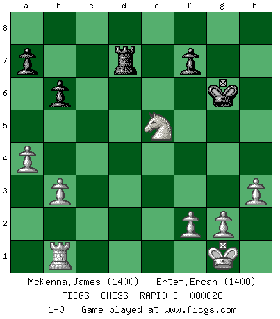 Last move : 1-0 2007 April 9 23:4:50 [Event "FICGS__CHESS__RAPID_C__000028"] [Site "FICGS"] [Date "2007.04.04"] [Round "1"] [White "McKenna,James"] [Black "Ertem,Ercan"] [Result "1-0"] [WhiteElo "1400"] [BlackElo "1400"] 1.d4 Nf6 2.c4 e6 3.Nc3 d5 4.e3 Nc6 5.Nf3 Be7 6.Bd3 O-O 7.O-O Nb4 8.Re1 Nxd3 9.Qxd3 b6 10.b3 Bb7 11.Ne5 c5 12.a4 cxd4 13.exd4 Bd6 14.Bg5 h6 15.Bh4 Rc8 16.cxd5 Bb4 17.Rec1 Bxd5 18.Nxd5 exd5 19.Rxc8 Qxc8 20.Bxf6 gxf6 21.Qg3+ Kh8 22.Ng4 Rg8 23.h3 f5 24.Qf4 Qe6 25.Qxh6+ Qxh6 26.Nxh6 Rc8 27.Nxf5 Rc3 28.Rb1 Kh7 29.Ne3 Kg6 30.Nxd5 Rd3 31.Nxb4 Rxd4 32.Nc6 Rd7 33.Ne5+ 1-0 Queen's pawn game Kingside Castling by player Black (move 6) Kingside Castling by player White (move 7) Player White won this chess game. Follow this game move after move (download)I know people who have all the will in the world, but still can't play good Chess. (Bobby Fischer) Es war undenkbar für die Behörden, dass ein sowjetischer Großmeister auf diese Art und Weise [Fischer-Taimanov 6:0] verliert, ohne dass es eine politischer Erklärung dafür gäbe. (Mark Taimanov) A la fecha, Fischer esta simplemente un nivel arriba de todos los mejores jugadores de Ajedrez del mundo. (John Jacobs) Même un GMI sait rarement calculer sur plus de cinq coups une attaque à sacrifices. (Rudolf Spielmann) The only sure thing about luck is that it will change. (Wilson Mizner)
