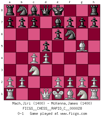 Last move : 0-1 2007 May 21 16:24:9 [Event "FICGS__CHESS__RAPID_C__000028"] [Site "FICGS"] [Date "2007.04.04"] [Round "1"] [White "Mach,Jiri"] [Black "McKenna,James"] [Result "0-1"] [WhiteElo "1400"] [BlackElo "1400"] 1.d4 d5 2.c4 e6 3.Nc3 Nf6 4.Bg5 Be7 0-1 This chess game has been lost on time (started : 2007.04.04 1:2:25) QGD : 4.Bg5 Be7 Player Black won this chess game. Follow this game move after move (download)Chess is a fighting game which is purely intellectual and includes chance. (Richard Reti) Im Leben werden Partien nie so unstrittig gewonnen wie im Spiel (Emanuel Lasker) Las ideas audaces son como las piezas del Ajedrez que avanzan hacia adelante. Ellas pueden ser vencidas, pero también pueden iniciar una partida victoriosa. (Goethe) Le système Elo représente seulement une moyenne. Il est simplement un indicateur de votre stabilité. (Anatoli Karpov) Perhaps chess is the wrong game for the times (The Chess Master and the Computer, by Garry Kasparov - 2010)