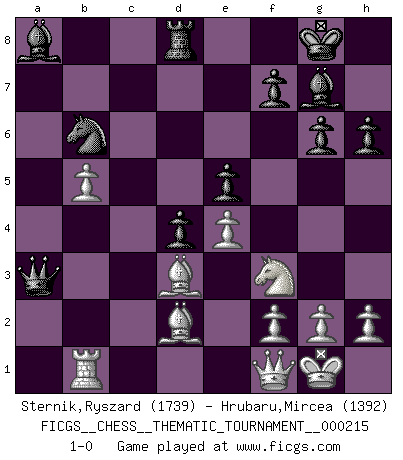 Last move : 1-0 2017 June 11 22:11:6 [Event "FICGS__CHESS__THEMATIC_TOURNAMENT__000215"] [Site "FICGS"] [Date "2017.02.22"] [Round "1"] [White "Sternik,Ryszard"] [Black "Hrubaru,Mircea"] [Result "1-0"] [WhiteElo "1739"] [BlackElo "1392"] 1.d4 Nf6 2.c4 g6 3.Nc3 d5 4.cxd5 Nxd5 5.e4 Nxc3 6.bxc3 Bg7 7.Nf3 c5 8.Bb5+ Nd7 9.O-O O-O 10.Bf4 a6 11.Be2 b5 12.a4 Bb7 13.axb5 axb5 14.Rxa8 Bxa8 15.Bd3 Qb6 16.Qe2 b4 17.Rb1 Qa7 18.cxb4 cxd4 19.Rc1 e5 20.Bd2 Nb6 21.b5 Qa3 22.Qf1 Rb8 23.Ng5 h6 24.Nf3 Rd8 25.Rb1 1-0 King's Indian defense, 3.Nc3 Kingside Castling by player White (move 9) Kingside Castling by player Black (move 9) Player White won this chess game. Follow this game move after move (download)The beauty of a move lies not in its' appearance but in the thought behind it. (Siegbert Tarrasch) Bobby Fischer ist kein Vorbild für die heutige Jugend. (Viktor Kortschnoi) Ciertamente el estado mental actual de Bobby Fischer es una tragedia. Uno de los mas grandes jugadores de Ajedrez del mundo -el orgullo y pena del Ajedrez Americano. (Frank Brady) Dieu déplace le joueur, et celui-ci la pièce. Quel Dieu derrière Dieu commence donc la trame ? Arturo Perez-Reverte (prix de littérature policière 1993). Ah, beer! The cause of, and the solution to, all of life's problems. (Homer Simpson)