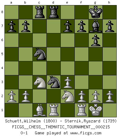 Last move : 0-1 2017 June 17 21:13:29 [Event "FICGS__CHESS__THEMATIC_TOURNAMENT__000215"] [Site "FICGS"] [Date "2017.02.22"] [Round "1"] [White "Schuett,Wilhelm"] [Black "Sternik,Ryszard"] [Result "0-1"] [WhiteElo "1800"] [BlackElo "1739"] 1.d4 Nf6 2.c4 g6 3.Nc3 d5 4.e3 Bg7 5.cxd5 Nxd5 6.Qb3 Nb6 7.Nf3 O-O 8.Be2 Be6 9.Qd1 c5 10.dxc5 Qxd1+ 11.Bxd1 N6d7 12.Na4 Na6 13.Nd4 Bd5 14.O-O Naxc5 15.Nc3 Bc4 16.Be2 Bxe2 17.Ndxe2 Rfd8 18.Bd2 Ne5 19.Rad1 Ned3 20.Bc1 Rac8 0-1 King's Indian defense, 3.Nc3 Kingside Castling by player Black (move 7) Kingside Castling by player White (move 14) Player Black won this chess game. Follow this game move after move (download)In a gambit you give up a Pawn for the sake of getting a lost game. (Samuel Standige Boden) Sehr viele beherrschen heutzutage das große Einmalseins des Schachspiels und kennen sogar dessen Logarithmentafeln auswendig - deshalb sollte man hin und wieder zu beweisen trachten, dass zwei mal zwei auch fünf sein kann. (Mikhail Nekhemyevich Tal) El Ajedrez es el arte del análisis. (Mikhail Botvinnik) Ce qui est bien, c'est d'avoir tout un tas de pièces en prise : l'adversaire ne peut en prendre qu'une à la fois. Cité par Thierry Audin. They misunderestimated me. (George W. Bush, Bentonville nov. 6, 2000)