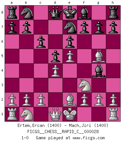 Last move : 1-0 2007 May 10 2:30:12 [Event "FICGS__CHESS__RAPID_C__000028"] [Site "FICGS"] [Date "2007.04.04"] [Round "1"] [White "Ertem,Ercan"] [Black "Mach,Jiri"] [Result "1-0"] [WhiteElo "1400"] [BlackElo "1400"] 1.e4 c6 2.Nf3 d5 3.e5 Bg4 4.Be2 e6 5.d4 Ne7 6.Bg5 1-0 This chess game has been lost on time (started : 2007.04.04 1:2:25) Caro-Kann defense Player White won this chess game. Follow this game move after move (download)I play correspondence chess because it is both art and science while chess is art only. (A player at FICGS) Ich brauche nur einen Blick auf das Schachbrett zu werfen, und weiß schon, was in der Stellung steckt, was geschehen kann und was geschehen wird. Alle übrigen suchen und prüfen, ich aber weiß es! (José Raúl Capablanca) En manos de Fischer's, una diminuta ventaja teórica es tan buena como tener una Reina de ventaja. (Isaac Kashdan) Il vaut toujours mieux jouer un plan faux de façon logique que de n'avoir pas de plan du tout. (Victor Kortchnoï) There are two major products that came out of Berkeley: LSD and UNIX. We do not believe this is to be a coincidence. (Jeremy S. Anderson)
