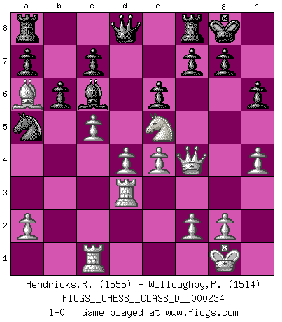 Last move : 1-0 2017 April 4 17:42:34 [Event "FICGS__CHESS__CLASS_D__000234"] [Site "FICGS"] [Date "2017.02.22"] [Round "1"] [White "Hendricks,Richard"] [Black "Willoughby,Peter"] [Result "1-0"] [WhiteElo "1555"] [BlackElo "1514"] 1.d4 d5 2.Nf3 Nf6 3.c4 e6 4.Nc3 Bb4 5.cxd5 Nxd5 6.Bd2 O-O 7.Qc2 Nxc3 8.bxc3 Be7 9.Bf4 Nc6 10.e4 b6 11.Bd3 Bb7 12.O-O Na5 13.Rfd1 h6 14.c4 Qd7 15.Rab1 Bc6 16.Qc3 Rfd8 17.Be3 Qe8 18.c5 Bf6 19.Rdc1 Rab8 20.Bf4 Qd7 21.Bg3 Rbc8 22.Ba6 Ra8 23.Qe1 Qe7 24.Rd1 Re8 25.Rbc1 Qd7 26.Qe3 Red8 27.Rd2 Qe7 28.h4 Qd7 29.Rd3 Rf8 30.Be5 Qd8 31.Qf4 Bxe5 32.Nxe5 1-0 Queen's pawn game Kingside Castling by player Black (move 6) Kingside Castling by player White (move 12) Player White won this chess game. Follow this game move after move (download)My opponents make good moves too. Sometimes I don't take these things into consideration. (Bobby Fischer) Gewöhnliche Menschen denken nur daran, wie sie ihre Zeit verbringen. Ein intelligenter Mensch versucht, sie auszunutzen. (Arthur Schopenhauer) Tu sabes que vas a perder. Aún cuando tenía la ventaja, yo sabía que iba a perder. - al estar jugando con Fischer (Andrew Soltis) Le jeu d'échecs fait naître et fortifie en nous plusieurs qualités précieuses dans le cours de l'existence, telles que la prévoyance, la circonspection, la prudence, et la persévérance. (Benjamin Franklin - 1783, la morale des échecs) Perhaps chess is the wrong game for the times (The Chess Master and the Computer, by Garry Kasparov - 2010)