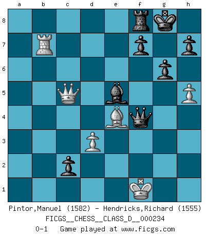 Last move : 0-1 2017 March 14 4:10:47 [Event "FICGS__CHESS__CLASS_D__000234"] [Site "FICGS"] [Date "2017.02.22"] [Round "1"] [White "Pintor,Manuel"] [Black "Hendricks,Richard"] [Result "0-1"] [WhiteElo "1582"] [BlackElo "1555"] 1.e4 c5 2.Nc3 Nc6 3.g3 g6 4.Bg2 Bg7 5.d3 Rb8 6.f4 b5 7.a3 a5 8.Nf3 b4 9.axb4 axb4 10.Nd5 e6 11.Ne3 d5 12.exd5 exd5 13.h3 Nge7 14.O-O O-O 15.Ng4 Nf5 16.Kh2 Bb7 17.Nge5 Nxe5 18.fxe5 d4 19.Bf4 Ne3 20.Bxe3 dxe3 21.Qe2 Bxf3 22.Rxf3 Bxe5 23.Qxe3 Bxb2 24.Ra7 Bd4 25.Qf4 Qe8 26.h4 Rd8 27.Rf1 c4 28.Rb7 cxd3 29.cxd3 Bc3 30.Be4 Qe6 31.h5 b3 32.Qc7 Be5 33.Qc5 Rc8 34.Qa7 Rc2+ 35.Rf2 Qf6 36.Rxc2 Qh4+ 37.Kg1 Qxg3+ 38.Kf1 bxc2 39.Qc5 Qf4+ 0-1 Sicilian : Closed Kingside Castling by player White (move 14) Kingside Castling by player Black (move 14) Player Black won this chess game. Follow this game move after move (download)Pawns are born free, yet they are everywhere in chains. (Rick Kennedy) Vom Schach wurde gesagt das Leben sei dafür nicht lange genug. Aber das ist der Fehler des Lebens, nicht des Schach'. (Irving Chernev) Un buen jugador siempre tiene buena suerte. (José Raúl Capablanca) L'action d'une oeuvre littéraire se déroule sur un champ de bataille. Les masques et les types du drame moderne correspondent aux pièces du jeu d'échecs. L'intrigue correspond aux coups et aux gambits, c'est à dire aux techniques du jeu telles qu'utilisées et interprétées par les joueurs. Les tactiques et les péripéties [mouvements] correspondent aux coups exécutés par l'adversaire. (Viktor Shklovsky) The mind is like a parachute, it only functions when its open. (Unknown)
