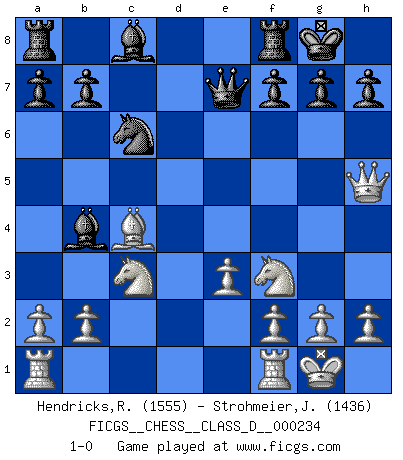 Last move : 1-0 2017 April 5 9:6:39 [Event "FICGS__CHESS__CLASS_D__000234"] [Site "FICGS"] [Date "2017.02.22"] [Round "1"] [White "Hendricks,Richard"] [Black "Strohmeier,Josef"] [Result "1-0"] [WhiteElo "1555"] [BlackElo "1436"] 1.d4 d5 2.Nf3 Nf6 3.c4 e6 4.Nc3 c5 5.cxd5 exd5 6.Bg5 Be7 7.dxc5 Bxc5 8.Bxf6 Qxf6 9.Qxd5 Qe7 10.e3 O-O 11.Bc4 Nc6 12.Qh5 Bb4 13.O-O 1-0 Queen's pawn game Kingside Castling by player Black (move 10) Kingside Castling by player White (move 13) Player White won this chess game. Follow this game move after move (download)The chessboard is the world, the pieces are the phenomena of the Universe, the rules of the game are what we call the laws of Nature and the player on the other side is hidden from us. (Thomas Huxley) Wenn Dein Gegner dir ein Remis anbietet, versuch herauszufinden, weshalb er glaubt schlechter zu stehen. (Nigel Short) El Ajedrez es el arte del análisis. (Mikhail Botvinnik) Le jeu d'échecs est comme rejeté hors du temps. (Antoine de Saint-Exupéry) Whatever you do, don't be bored. This is absolutely the most exciting time we could have possibly hoped to be alive. And things are just starting. (From movie Waking life)