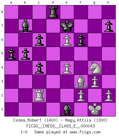Last move : 1-0 2007 October 9 12:6:29 [Event "FICGS__CHESS__CLASS_E__000043"] [Site "FICGS"] [Date "2007.04.04"] [Round "1"] [White "Csoma,Robert"] [Black "Nagy,Attila"] [Result "1-0"] [WhiteElo "1400"] [BlackElo "1300"] 1.d4 d5 2.c4 c6 3.Nc3 Nf6 4.Nf3 e6 5.Bf4 dxc4 6.a4 Bb4 7.e3 Nd5 8.Qc2 Qa5 9.Rc1 b5 10.Be5 Qxa4 11.Bxg7 Qxc2 12.Rxc2 Rg8 13.Be5 Nd7 14.Bg3 N7f6 15.Ne5 Bb7 16.Be2 Ne4 17.O-O Nexc3 18.bxc3 Nxc3 19.Bh5 Rf8 20.Bf4 a5 21.Bh6 Ke7 22.Bxf8+ Rxf8 23.Bf3 Nd5 24.e4 Nf4 25.Rd1 f6 26.Ng4 Rd8 27.g3 Nd3 28.d5 Ne1 29.Rxe1 Bxe1 30.dxe6 1-0 This chess game has been lost on time (started : 2007.04.04 9:31:25) QGD Slav defense Kingside Castling by player White (move 17) Player White won this chess game. Follow this game move after move (download)All I want to do, ever, is just play Chess. (Bobby Fischer) Je mehr ich von der FIDE weiss, um so weniger verstehe ich. (Alexander Kalifman) El pensamiento metódico es mas útil en el Ajedrez que la inspiración. (C. J. S. Purdy) Je crois qu'il existe des manières très spécifiques de jouer efficacement contre une machine. Evidemment, nous n'avons aucune chance en technique pure, parce que l'ordinateur calcule de manière parfaite. Mais lorsque nous faisons appel à notre cerveau, en utilisant l'intuition et la compréhension, alors nous restons beaucoup plus forts. (Anatoli Karpov) All the biggest technological inventions created by man - the airplane, the automobile, the computer - says little about his intelligence, but speaks volumes about his laziness. (Mark Kennedy)