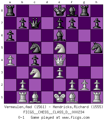 Last move : 0-1 2017 March 16 20:14:46 [Event "FICGS__CHESS__CLASS_D__000234"] [Site "FICGS"] [Date "2017.02.22"] [Round "1"] [White "Vermeulen,Aad"] [Black "Hendricks,Richard"] [Result "0-1"] [WhiteElo "1561"] [BlackElo "1555"] 1.d4 d5 2.c4 dxc4 3.Nc3 a6 4.a4 Nc6 5.e3 Na5 6.Nf3 Nf6 7.Ne5 Be6 8.Qf3 c5 9.dxc5 Qc7 10.Qf4 Nb3 11.Rb1 g5 12.Qxg5 Rg8 13.Qf4 Nh5 14.Qe4 Nxc5 0-1 Queen's gambit accepted Player Black won this chess game. Follow this game move after move (download)Daring ideas are like Chess men moved forward. They may be beaten, but they may start a winning game. (Johann Wolfgang von Goethe) Die westlichen Werte sind eine Sprache, welche die Putin-Administration nicht versteht. (Garry Kasparov) Sin errores no puede haber brillantez. (Emanuel Lasker) Les Echecs mettent en conflit, non pas deux intelligences, mais deux volontés. (Lasker) Treat your password like your toothbrush. Don't let anybody else use it, and get a new one every six months. (Clifford Stoll)