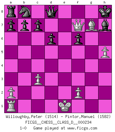Last move : 1-0 2017 March 7 21:5:14 [Event "FICGS__CHESS__CLASS_D__000234"] [Site "FICGS"] [Date "2017.02.22"] [Round "1"] [White "Willoughby,Peter"] [Black "Pintor,Manuel"] [Result "1-0"] [WhiteElo "1514"] [BlackElo "1582"] 1.h4 e5 2.d4 exd4 3.c3 dxc3 4.Nxc3 Nf6 5.Nf3 Bb4 6.Bd2 O-O 7.h5 h6 8.g4 Nxg4 9.Bh3 d6 10.Bxg4 Bxg4 11.Rg1 Bxf3 12.Bxh6 Bxe2 13.Qd4 Bxc3+ 14.bxc3 f6 15.Qd5+ Rf7 16.Rxg7+ Kh8 17.Qxf7 Bd3 18.Rh7+ Bxh7 19.Bg7+ 1-0 Anti-Borg (Desprez) Opening Kingside Castling by player Black (move 6) Player White won this chess game. Follow this game move after move (download)First-class players lose to second class players because second-class players sometimes play a first-class game. (Tarrasch) Ich bin Weltmeister und muß mit niemandem irgend etwas diskutieren. (Viswanathan Anand) No es tiempo de jugar al Ajedrez cuando la casa esta en llamas. (Proverbio Italiano) Nous vivons dans un monde échiquéen : chaque jour qui passe est un défi à relever. (Philosophe Sasha) Art is not a thing, it is a way. (Elbert Hubbard)
