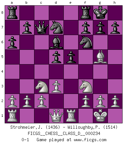Last move : 0-1 2017 April 5 9:5:6 [Event "FICGS__CHESS__CLASS_D__000234"] [Site "FICGS"] [Date "2017.02.22"] [Round "1"] [White "Strohmeier,Josef"] [Black "Willoughby,Peter"] [Result "0-1"] [WhiteElo "1436"] [BlackElo "1514"] 1.e4 e5 2.Bc4 Nf6 3.d3 c6 4.Nf3 d5 5.exd5 cxd5 6.Bb5+ Bd7 7.Bxd7+ Nbxd7 8.O-O Qc7 9.Re1 Bd6 10.Nc3 a6 11.Bg5 O-O 0-1 Bishop's Opening : Berlin defense Kingside Castling by player White (move 8) Kingside Castling by player Black (move 11) Player Black won this chess game. Follow this game move after move (download)My opponents make good moves too. Sometimes I don't take these things into consideration. (Bobby Fischer) In der Schule lernt man nichts. Es ist nur Zeitverschwendung. (Robert James Fischer) Los libros de Ajedrez deben de usarse igual como usamos los anteojos: para mejorar la vista, aunque algunos jugadores los quieren usar como si ellos les otorgaran la vision. (José Raúl Capablanca) Pour se monter efficace, un Cavalier a besoin d'avant-postes ! Les Cavaliers font les meilleurs bloqueurs de pions passés. Industry executives and analysts often mistakenly talk about strategy as if it were some kind of chess match. But in chess, you have just two opponents, each with identical resources, and with luck playing a minimal role. The real world is much more like a poker game, with multiple players trying to make the best of whatever hand fortune has dealt them. In our industry, Bill Gates owns the table until someone proves otherwise. (David Moschella, 'Computerworld')
