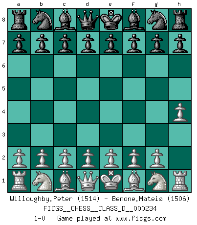 Last move : 1-0 2017 April 3 22:28:58 [Event "FICGS__CHESS__CLASS_D__000234"] [Site "FICGS"] [Date "2017.02.22"] [Round "1"] [White "Willoughby,Peter"] [Black "Benone,Mateia"] [Result "1-0"] [WhiteElo "1514"] [BlackElo "1506"] 1.h4 1-0 This chess game has been lost on time (started : 2017.02.22 15:8:6) Anti-Borg (Desprez) Opening Player White won this chess game. Follow this game move after move (download)A thorough understanding of the typical mating continuations makes the most complicated sacrificial combinations leading up to them not only not difficult, but almost a matter of course. (Siegbert Tarrasch) Der Partner hat auch seine Existenzberechtigung. (Savielly Grigorievitsch Tartakower) De eso se trata el Ajedrez. Un día le das una lección a tu oponente y al día siguiente el te da una a tí. (Bobby Fischer) Celui qui prend des risques peut perdre, celui qui n'en prend pas perd toujours. (Xavier Tartacover) If you are going through hell, keep going. (Winston Churchill)
