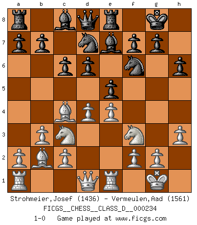 Last move : 1-0 2017 March 23 14:25:54 [Event "FICGS__CHESS__CLASS_D__000234"] [Site "FICGS"] [Date "2017.02.22"] [Round "1"] [White "Strohmeier,Josef"] [Black "Vermeulen,Aad"] [Result "1-0"] [WhiteElo "1436"] [BlackElo "1561"] 1.e4 d6 2.d4 Nf6 3.Nc3 Nbd7 4.Nf3 e5 5.Bc4 h6 6.O-O Be7 7.Re1 O-O 8.h3 Re8 9.b3 c6 10.Bb2 1-0 Pirc defense Kingside Castling by player White (move 6) Kingside Castling by player Black (move 7) Player White won this chess game. Follow this game move after move (download)One of these modest little moves may be more embarrassing to your opponent than the biggest threat. (Siegbert Tarrasch) Eine Person mit durchschnittlichem IQ kann etwa eine ELO von 2000 erreichen. (Jonathan Levitt) Tu sabes que vas a perder. Aún cuando tenía la ventaja, yo sabía que iba a perder. - al estar jugando con Fischer (Andrew Soltis) Toute estimation doit être constamment réévaluée. (Jacob Estrin) Without enthusiasm, virtue functions not at all, and vice only poorly. (Mignon McLaughlin, The Neurotic's Notebook, 1960)