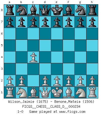 Last move : 1-0 2017 April 5 10:31:31 [Event "FICGS__CHESS__CLASS_D__000234"] [Site "FICGS"] [Date "2017.02.22"] [Round "1"] [White "Wilson,Jaimie"] [Black "Benone,Mateia"] [Result "1-0"] [WhiteElo "1675"] [BlackElo "1506"] 1.c4 1-0 This chess game has been lost on time (started : 2017.02.22 15:8:6) English Opening Player White won this chess game. Follow this game move after move (download)The game of chess is the touchstone of the intellect. (Goethe) Ich verlor meine Bürgerrechte, mein Gehalt wurde mir nicht mehr bezahlt und ich wurde zensiert und durfte nicht mehr ins Ausland reisen. [nach dem Match Fischer-Taimanov 6:0] (Mark Taimanov) Me gusta decir que Bobby Fischer fue el mejor jugador que jamás haya existido. Pero lo que hizo de Fischer un genio, fue su habilidad de mezclar una frescura y pragmatismo Americano con ideas Rusas acerca de la estrategia. (Bruce Pandolfini) La vie est comme un jeu d'échecs : nous esquissons un plan, mais celui-ci est tributaire de ce que daignent faire l'adversaire aux échecs et le destin dans la vie. (Arthur Schopenhauer) In every real man a child is hidden that wants to play. (Friedrich Nietzsche)