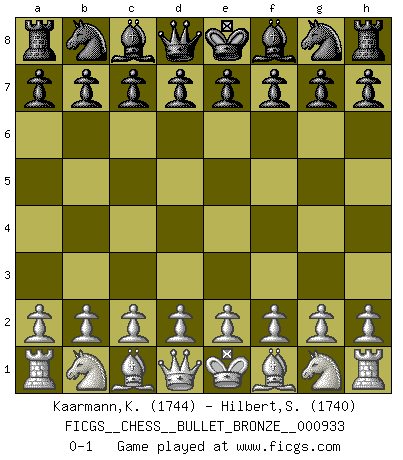 Last move : 0-1 2017 February 26 0:44:27 [Event "FICGS__CHESS__BULLET_BRONZE__000933"] [Site "FICGS"] [Date "2017.02.26"] [Round "1"] [White "Kaarmann,Karel"] [Black "Hilbert,Stephan J."] [Result "0-1"] [WhiteElo "1744"] [BlackElo "1740"] 0-1 This chess game has been lost on time (started : 2017.02.26 0:33:51) Player Black won this chess game. Follow this game move after move (download)What would Chess be without silly mistakes ? (Kurt Richter) Ich würde die 30 stärksten Spieler der USA im Simultanspiel besiegen. (José Raúl Capablanca) Mis oponentes también hacen buenas movidas. A veces yo no tomo esas cosas en consideración. (Bobby Fischer) Le joueur d'Echecs qui veut atteindre le top est obligé de développer son propre credo créatif. Alexeï Stepanovicth Souétine. Il est facile d'écrire des livres ! Ce qui est difficile, c'est de jouer ! (Alexeï Stepanovicth Souétine) Happy endings are just stories that haven't finished yet. (Jane Smith in Mr & Mrs Smith)