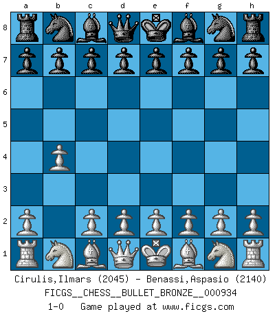 Last move : 1-0 2017 February 27 16:44:30 [Event "FICGS__CHESS__BULLET_BRONZE__000934"] [Site "FICGS"] [Date "2017.02.27"] [Round "1"] [White "Cirulis,Ilmars"] [Black "Benassi,Aspasio"] [Result "1-0"] [WhiteElo "2045"] [BlackElo "2140"] 1.b4 1-0 This chess game has been lost on time (started : 2017.02.27 16:35:45) Polish (Sokolsky) opening Player White won this chess game. Follow this game move after move (download)All Chess players should have a hobby. (Savielly Tartakower) Wenn sie aufgeben, dann danke ich Ihnen für das Spiel (Eventualzug beim Fernschach). (Anonymous) Diferente gente reacciona diferentemente en aceptar la derrota. (Bobby Fischer) Les erreurs sont comme les malheurs, elles n'arrivent jamais seules. (Siegbert Tarrasch) Political correctness is subjecting us to gross incompetence. (Johann Piek)