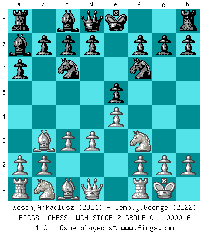 Last move : 1-0 2017 May 4 2:31:16 [Event "FICGS__CHESS__WCH_STAGE_2_GROUP_01__000016"] [Site "FICGS"] [Date "2017.02.28"] [Round "1"] [White "Wosch,Arkadiusz"] [Black "Jempty,George"] [Result "1-0"] [WhiteElo "2331"] [BlackElo "2222"] 1.e4 e5 2.Nf3 Nc6 3.Bc4 Nf6 4.d3 Bc5 5.c3 a6 6.Bb3 Ba7 7.O-O 1-0 Two knights defense (Modern Bishop's Opening) Kingside Castling by player White (move 7) Player White won this chess game. Follow this game move after move (download)I prefer to lose a really good game than to win a bad one. (David Levy) Taktik ist was man tun muß, wenn etwas zu tun ist. Strategie ist was man tun muß, wenn nichts zu tun ist. (Savielly Grigorievitsch Tartakower) Tu cuerpo tiene que estar en óptima condición. Tu Ajedrez se deteriora como lo hace tu cuerpo. No puedes separar la mente y el cuerpo. (Bobby Fischer) RxDa4 pat (...) The problem with manipulation is that people can turn on you. (Horatio Caine, C.S.I. Miami)