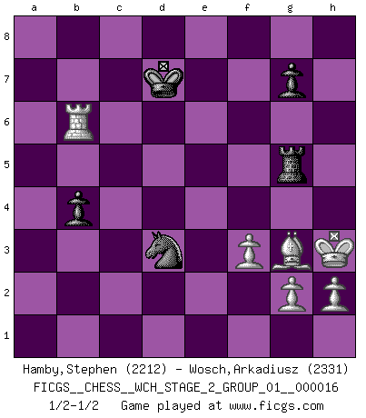 Last move : 1/2-1/2 2017 July 2 18:47:50 [Event "FICGS__CHESS__WCH_STAGE_2_GROUP_01__000016"] [Site "FICGS"] [Date "2017.02.28"] [Round "1"] [White "Hamby,Stephen"] [Black "Wosch,Arkadiusz"] [Result "1/2-1/2"] [WhiteElo "2212"] [BlackElo "2331"] 1.d4 Nf6 2.c4 e6 3.Nc3 Bb4 4.f3 d5 5.a3 Bxc3+ 6.bxc3 c5 7.cxd5 Nxd5 8.dxc5 f5 9.Nh3 O-O 10.Nf4 Nxc3 11.Qc2 Nd5 12.Nxd5 exd5 13.Bf4 Qf6 14.Rb1 Nd7 15.e3 b6 16.cxb6 axb6 17.Qb2 Qxb2 18.Rxb2 Rxa3 19.Kf2 Ra1 20.Rg1 Ba6 21.Bxa6 Rxa6 22.Rd1 Ra5 23.Rbd2 Kf7 24.Rxd5 Rxd5 25.Rxd5 Ke6 26.Rd6+ Ke7 27.Rd4 Rc8 28.e4 fxe4 29.Rxe4+ Kf7 30.Bd6 Nc5 31.Rh4 Rd8 32.Bc7 Rd2+ 33.Kg3 b5 34.Rxh7 Rd5 35.Rh4 Nd3 36.Rh8 Rg5+ 37.Kh3 Ke6 38.Rb8 b4 39.Rb6+ Kd7 40.Bg3 1/2-1/2 Nimzo-Indian : Kmoch variation Kingside Castling by player Black (move 9) This chess game ended in a draw. Follow this game move after move (download)If your opponent cannot do anything active, then don't rush the position; instead you should let him sit there, suffer, and beg you for a draw. (Jeremy Silman) Er war ein guter Schachspieler, aber ich kann Leute nicht ausstehen, die 'Heil Hitler' rufen (Über Alexander Aljechin). (Miguel Najdorf) No hay un Gran Maestro de Ajedrez que sea normal; solo se diferencían ellos por la magnitud de su locura. (Viktor Korchnoi) Karpov est une pièce de musée. (Garry Kasparov) It's unlucky to be superstitious. (Dave Enteles)