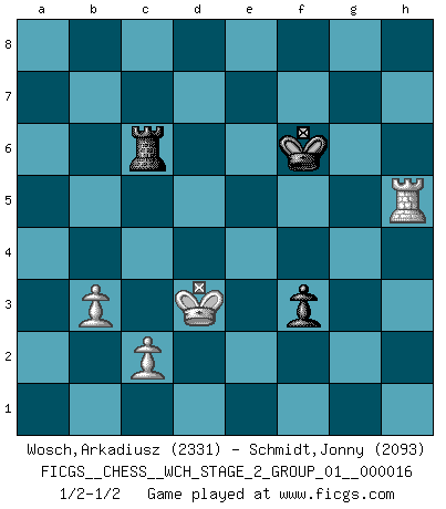Last move : 1/2-1/2 2017 June 21 0:19:47 [Event "FICGS__CHESS__WCH_STAGE_2_GROUP_01__000016"] [Site "FICGS"] [Date "2017.02.28"] [Round "1"] [White "Wosch,Arkadiusz"] [Black "Schmidt,Jonny"] [Result "1/2-1/2"] [WhiteElo "2331"] [BlackElo "2093"] 1.e4 c5 2.Nf3 d6 3.d4 cxd4 4.Nxd4 Nf6 5.Nc3 a6 6.Be3 Ng4 7.Bg5 h6 8.Bh4 g5 9.Bg3 Bg7 10.h3 Nf6 11.Qf3 Qb6 12.O-O-O Nc6 13.Nxc6 Qxc6 14.Be2 Qc5 15.Rhe1 O-O 16.Bd3 Bd7 17.Qe2 b5 18.e5 dxe5 19.Bxe5 Rfd8 20.a3 b4 21.axb4 Qxb4 22.Bc4 Qa5 23.f4 gxf4 24.Qf3 Bf5 25.Qxf4 Bg6 26.Kb1 Nh5 27.Rxd8+ Rxd8 28.Qg4 Kf8 29.Bxg7+ Nxg7 30.Qf4 Qg5 31.Qxg5 hxg5 32.Kc1 Rd6 33.Re5 Nf5 34.Bd3 f6 35.Ra5 Nh4 36.g3 Bxd3 37.gxh4 Bf1 38.hxg5 Bxh3 39.b3 Kf7 40.gxf6 exf6 41.Ne4 Rc6 42.Nc5 f5 43.Nxa6 f4 44.Nb4 f3 45.Nd3 Kf6 46.Rh5 Bf5 47.Kd2 Bxd3 48.Kxd3 1/2-1/2 Sicilian : Najdorf, Byrne (English) attack Queenside Castling by player White (move 12) Kingside Castling by player Black (move 15) 10 pieces endgame at move 40 : White KRNPP , Black KRBPP WHITE : King + 1 Rook 1 Knight 2 Pawns BLACK : King + 1 Rook 1 Bishop 2 Pawns 9 pieces endgame at move 43 : White KRNPP , Black KRBP WHITE : King + 1 Rook 1 Knight 2 Pawns BLACK : King + 1 Rook 1 Bishop 1 Pawn 8 pieces endgame at move 47 : White KRPP , Black KRBP WHITE : King + 1 Rook 2 Pawns BLACK : King + 1 Rook 1 Bishop 1 Pawn 7 pieces endgame at move 48 : White KRPP , Black KRP WHITE : King + 1 Rook 2 Pawns BLACK : King + 1 Rook 1 Pawn This chess game ended in a draw. Follow this game move after move (download)Bobby is the most misunderstood, misquoted celebrity walking the face of this earth. (Yasser Seirawan) Ich weiss nicht was Gott gegen mich auf 1.e4 antworten würde. (Robert James Fischer) Aunque la mayoría de la gente disfruta observar las partidas de los grandes Maestros de ataque, algunos de los jugadores mas notables en la historia han sido los jugadores silenciosos posicionales. Lentamente ellos te aplastan despojandote de tu espacio, congestionando tus piezas y dejandote virtualmente sin nada que hacer. (Yasser Seirawan) Assurément je connaissais par expérience le mystérieux attrait de ce jeu royal, le seul entre tous les jeux inventés par les hommes qui échappe souverainement à la tyrannie du hasard, le seul où l'on ne doive sa victoire qu'à son intelligence ou plutôt à une certaine forme d'intelligence. Mais n'est-ce pas déjà le limiter injurieusement que d'appeler les échecs un jeu ? N'est-ce pas une science, un art ou quelque chose qui, comme le cercueil de Mahomet entre ciel et terre, est suspendu entre l'un et l'autre, et qui réunit un nombre incroyable de contraires ? [...] C'est une pensée qui ne mène à rien, une mathématique qui n'établit rien, un art qui ne laisse pas d'uvre, une architecture sans matière; et il l'a prouvé néanmoins qu'il était plus durable, à sa manière, que les livres ou que tout autre monument, ce jeu unique qui appartient à tous les peuples et à tous les temps, et dont personne ne sait quel dieu en fit don à la terre pour tuer l'ennui, pour aiguiser l'esprit et stimuler l'âme. Où commence-t-il, où finit-il ? (Stefan Zweig) In my experience, there's no such thing as luck. (Obi-Wan Kenobi in Star Wars ep.4)