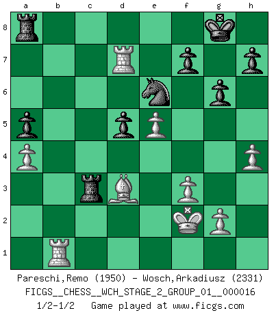 Last move : 1/2-1/2 2017 April 22 19:19:33 [Event "FICGS__CHESS__WCH_STAGE_2_GROUP_01__000016"] [Site "FICGS"] [Date "2017.02.28"] [Round "1"] [White "Pareschi,Remo"] [Black "Wosch,Arkadiusz"] [Result "1/2-1/2"] [WhiteElo "1950"] [BlackElo "2331"] 1.d4 Nf6 2.c4 e6 3.Nc3 Bb4 4.Qc2 O-O 5.e4 d5 6.e5 Ne4 7.a3 Bxc3+ 8.bxc3 c5 9.Ne2 cxd4 10.Nxd4 Qa5 11.f3 Qxc3+ 12.Qxc3 Nxc3 13.Bd2 Na4 14.cxd5 exd5 15.Bb4 Re8 16.Kf2 Bd7 17.Bd6 Na6 18.Rb1 N6c5 19.Nb5 Ne6 20.Nc7 Nxc7 21.Rxb7 Rec8 22.Bd3 Ne6 23.Rxd7 g6 24.h4 Nac5 25.Bxc5 Rxc5 26.a4 a5 27.Rb1 Rc3 28.Rd1 Rc5 29.Rb1 Rc3 1/2-1/2 Nimzo-Indian : Classical variation Kingside Castling by player Black (move 4) This chess game ended in a draw. Follow this game move after move (download)I like to say that Bobby Fischer was the greatest player ever. But what made Fischer a genius was his ability to blend an American freshness and pragmatism with Russian ideas about strategy. (Bruce Pandolfini) Jeder Schachmeister war einmal ein Anfänger. (Irving Chernev) Una de estas pequeñas movidas modestas pudieran ser mas molestas a tu oponente que la amenaza mas grande. (Siegbert Tarrasch) Le système Elo représente seulement une moyenne. Il est simplement un indicateur de votre stabilité. (Anatoli Karpov) The good fighters of old first put themselves beyond the possibility of defeat, and then waited for an opportunity of defeating the enemy. (Sun Tzu)