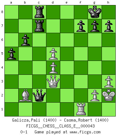 Last move : 0-1 2007 July 19 16:53:59 [Event "FICGS__CHESS__CLASS_E__000043"] [Site "FICGS"] [Date "2007.04.04"] [Round "1"] [White "Galicza,Pali"] [Black "Csoma,Robert"] [Result "0-1"] [WhiteElo "1400"] [BlackElo "1400"] 1.b4 e6 2.Bb2 Nf6 3.a3 a5 4.b5 c6 5.e3 Be7 6.Nf3 O-O 7.Be2 d5 8.d4 Nbd7 9.c4 cxb5 10.cxb5 Ne4 11.Nbd2 Ndf6 12.a4 Bb4 13.Qc2 Nxd2 14.Nxd2 Ne4 15.Rd1 Bd7 16.O-O Nxd2 17.Rxd2 Bxd2 18.Qxd2 Rc8 19.f4 b6 20.Bd3 Rc7 21.h3 Qe7 22.Kh2 Rfc8 23.Qf2 Qb4 24.e4 Qxa4 25.f5 exf5 26.exd5 Bxb5 27.Qxf5 Bxd3 28.Qxd3 Qc2 0-1 Polish (Sokolsky) opening Kingside Castling by player Black (move 6) Kingside Castling by player White (move 16) Player Black won this chess game. Follow this game move after move (download)Without error there can be no brilliancy. (Emanuel Lasker) Ich kämpfe solange mein Gegner einen Fehler machen kann. (Emanuel Lasker) Solo existe una cosa que Fischer hace en el Ajedrez sin placer: ¡perder!. (Boris Spassky) Des combinaisons [dans le jeu d'échecs] pareilles à des mélodies. Je crois entendre pour ainsi dire la musique des coups... (Vladimir Nabokov) The project of the man are lower than those of the sky. (Chinese proverb)