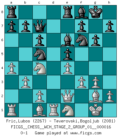 Last move : 0-1 2017 May 13 15:39:15 [Event "FICGS__CHESS__WCH_STAGE_2_GROUP_01__000016"] [Site "FICGS"] [Date "2017.02.28"] [Round "1"] [White "Fric,Lubos"] [Black "Teverovski,Bogoljub"] [Result "0-1"] [WhiteElo "2267"] [BlackElo "2081"] 1.Nf3 d5 2.g3 c6 3.Bg2 Nf6 4.O-O g6 5.d3 Bg7 6.Nbd2 O-O 7.e4 dxe4 8.dxe4 Qc7 9.Qe2 e5 10.Nc4 Re8 11.Rd1 Na6 12.a4 Nc5 13.Ne1 Bg4 14.f3 Be6 15.b3 Bf8 0-1 This chess game has been lost on time (started : 2017.02.28 2:38:44) Reti : King's Indian attack (Barcza system) Kingside Castling by player White (move 4) Kingside Castling by player Black (move 6) Player Black won this chess game. Follow this game move after move (download)No one ever won a game by resigning. (Unknown) Es ist nicht das erste mal, dass sich die FIDE dem Arabischen Geld gebeugt hat (über die FIDE WM 2004 in Lybien). (Larry Evans) Te sientas frente a un tablero y repentinamente tu corazón brinca. Tu mano tiembla al tomar una pieza y moverla. Pero lo que el Ajedrez te enseña es que tu debes permanecer ahí con calma y pensar de que si realmente es una buena idea o de que si hay otras ideas mejores. (Stanley Kubrick) Ce n'est pas pour s'amuser qu'il joue aux échecs : il célèbre un culte. (Vladimir Nabokov) At work, the authority of a person is inversely proportional to the number of pens that person is carrying. (Dan Rotaru)