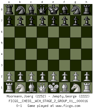 Last move : 0-1 2017 March 30 10:6:26 [Event "FICGS__CHESS__WCH_STAGE_2_GROUP_01__000016"] [Site "FICGS"] [Date "2017.02.28"] [Round "1"] [White "Moormann,Joerg"] [Black "Jempty,George"] [Result "0-1"] [WhiteElo "2252"] [BlackElo "2222"] 0-1 This chess game has been lost on time (started : 2017.02.28 2:38:44) Player Black won this chess game. Follow this game move after move (download)Chess is life. (Bobby Fischer) Glücklicherweise sind Großmeister Ruben Fines reine Schachbücher weniger phallozentrisch [als seine Schachpsychologie] und deswegen auch weniger lächerlich. (Nigel Short) Si yo gano un torneo, yo lo gano por mí mismo. Yo hago las jugadas. Nadie me ayuda. (Bobby Fischer) Karpov est une pièce de musée. (Garry Kasparov) The only thing that overcomes hard luck is hard work. (Harry Golden)