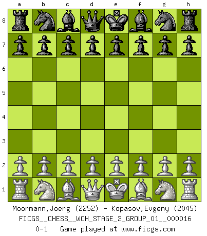 Last move : 0-1 2017 March 30 10:6:26 [Event "FICGS__CHESS__WCH_STAGE_2_GROUP_01__000016"] [Site "FICGS"] [Date "2017.02.28"] [Round "1"] [White "Moormann,Joerg"] [Black "Kopasov,Evgeny"] [Result "0-1"] [WhiteElo "2252"] [BlackElo "2045"] 0-1 This chess game has been lost on time (started : 2017.02.28 2:38:44) Player Black won this chess game. Follow this game move after move (download)Bobby just drops the pieces and they fall on the right squares. (Miguel Najdorf) Frage: Gibt es etwas was Sie mehr lieben als Autobahnen ohne Tempobegrenzungen? - Antwort: Deutsche Frauen ohne Tempobegrenzungen. (Loek van Wely) El Ajedrez es despiadado: debes de estar preparado para matar gente. (Nigel Short) Mais n'est-ce pas déjà le limiter injurieusement que d'appeler les échecs un jeu? N'est-ce pas aussi une science, un art, ou quelque chose qui, comme le cercueil de Mahomet entre ciel et terre, est suspendu entre l'un et l'autre, et qui réunit un nombre incroyable de contraires ? (Stefan Zweig) A computer lets you make more mistakes faster than any invention in human history - with the possible exceptions of handguns and tequila. (Mitch Ratcliffe)