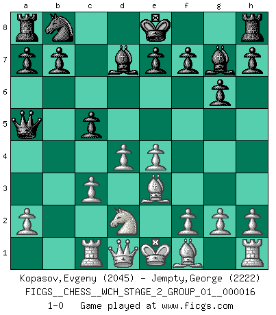 Last move : 1-0 2017 May 6 14:51:59 [Event "FICGS__CHESS__WCH_STAGE_2_GROUP_01__000016"] [Site "FICGS"] [Date "2017.02.28"] [Round "1"] [White "Kopasov,Evgeny"] [Black "Jempty,George"] [Result "1-0"] [WhiteElo "2045"] [BlackElo "2222"] 1.d4 Nf6 2.c4 g6 3.Nc3 d5 4.cxd5 Nxd5 5.e4 Nxc3 6.bxc3 Bg7 7.Nf3 c5 8.Be3 Qa5 9.Nd2 Bd7 10.Rc1 1-0 King's Indian defense, 3.Nc3 Player White won this chess game. Follow this game move after move (download)If Chess is a science, it's a most inexact one. If Chess is an art, it is too exacting to be seen as one. If Chess is a sport, it's too esoteric. If Chess is a game, it's too demanding to be just a game. If Chess is a mistress, she's a demanding one. If Chess is a passion, it's a rewarding one. If Chess is life, it's a sad one. (Unknown) Wer wird heute Abend ihr Gegner sein? -- Heute Abend spiele ich gegen die schwarzen Steine. (Akiba Rubinstein) a manera como él juega al Ajedrez, demuestra la completa naturaleza de un hombre. (Stanley Ellin) Avant la finale, les dieux ont créé le milieu de partie. (Tarrasch) You must do what you feel is right... of course. (Obi-Wan Kenobi in Star Wars ep.4)