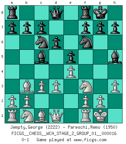 Last move : 0-1 2017 May 4 2:31:16 [Event "FICGS__CHESS__WCH_STAGE_2_GROUP_01__000016"] [Site "FICGS"] [Date "2017.02.28"] [Round "1"] [White "Jempty,George"] [Black "Pareschi,Remo"] [Result "0-1"] [WhiteElo "2222"] [BlackElo "1950"] 1.e4 e5 2.Nf3 Nc6 3.Bc4 Bc5 4.c3 Nf6 5.d3 d6 6.Bb3 O-O 7.O-O Bg4 8.h3 Bh5 0-1 Giuoco Piano Kingside Castling by player Black (move 6) Kingside Castling by player White (move 7) Player Black won this chess game. Follow this game move after move (download)Suddenly it was obvious to me in my analysis I had missed what Fischer had found with the greatest of ease at the board. (Mikhail Botvinnik) Der zweitbeste Zug ist oft der einzig richtige. (Savielly Grigorievitsch Tartakower) Dejen al perfeccionista jugar por correo. (Yasser Seirawan) Les Echecs représentent une sphère d'idées créatrices basée sur la volonté des deux protagonistes. (Smyslov) The ego is not master in its own house. (Sigmund Freud)